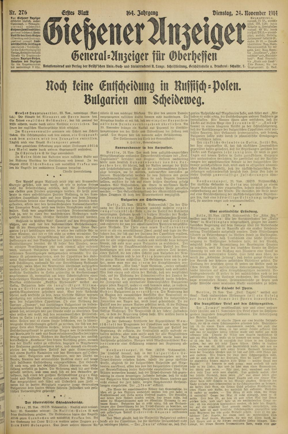 Großes Hauptquartier, 23. Nov., vormittags. (Amtlich.) Die Kämpfe bei Nieuport und Ipern dauern fort. Ein kleines englisches Geschwader, das sich zweimal der Küste näherte, wurde durch unsere Artillerie vertrieben. Das Feuer der englischen Marinegeschütze blieb erfolglos.