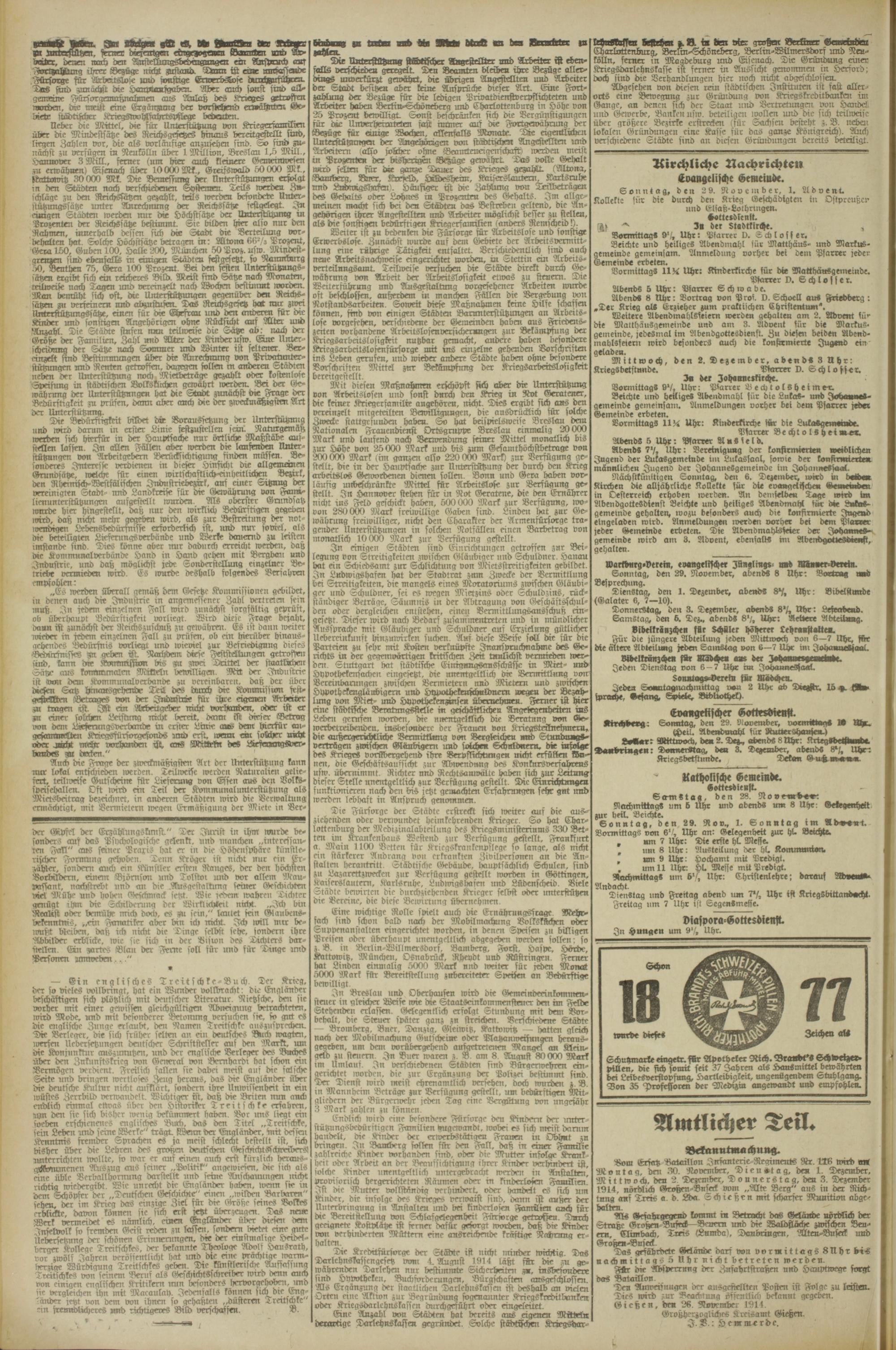 Sonntag, den 29. November, 1, Advent. Kollekte für die durch den Krieg Geschädigten in Ostpreußen und Elsaß-Loihringen.