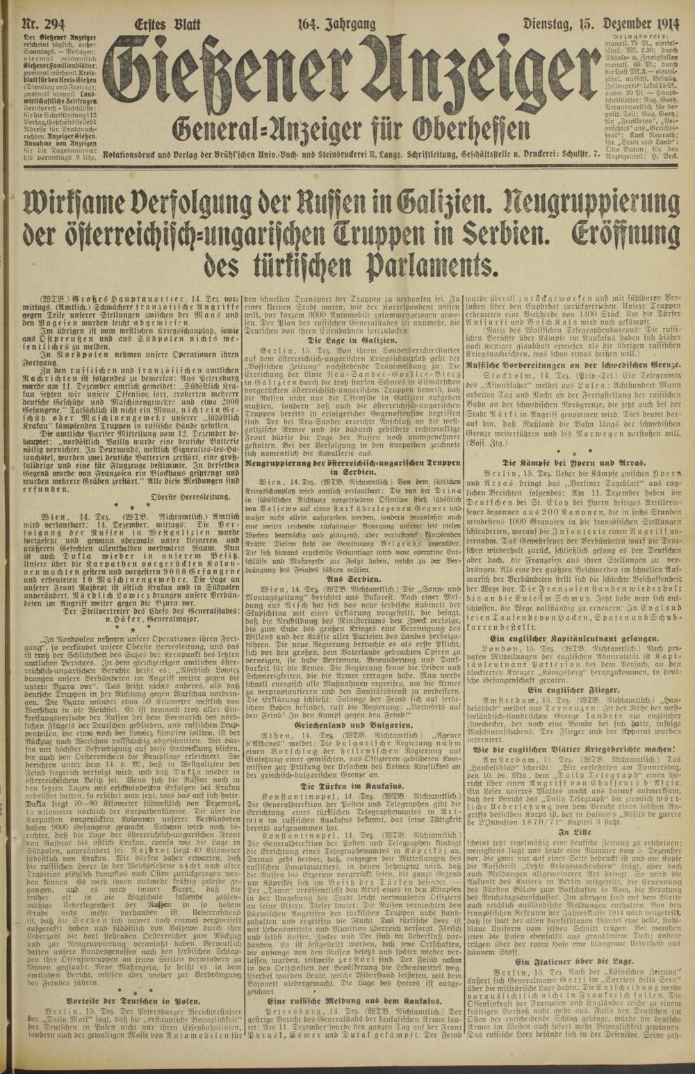 Erstes Blatt M. Jahrgang Dienstag, 15. Dezember 1914