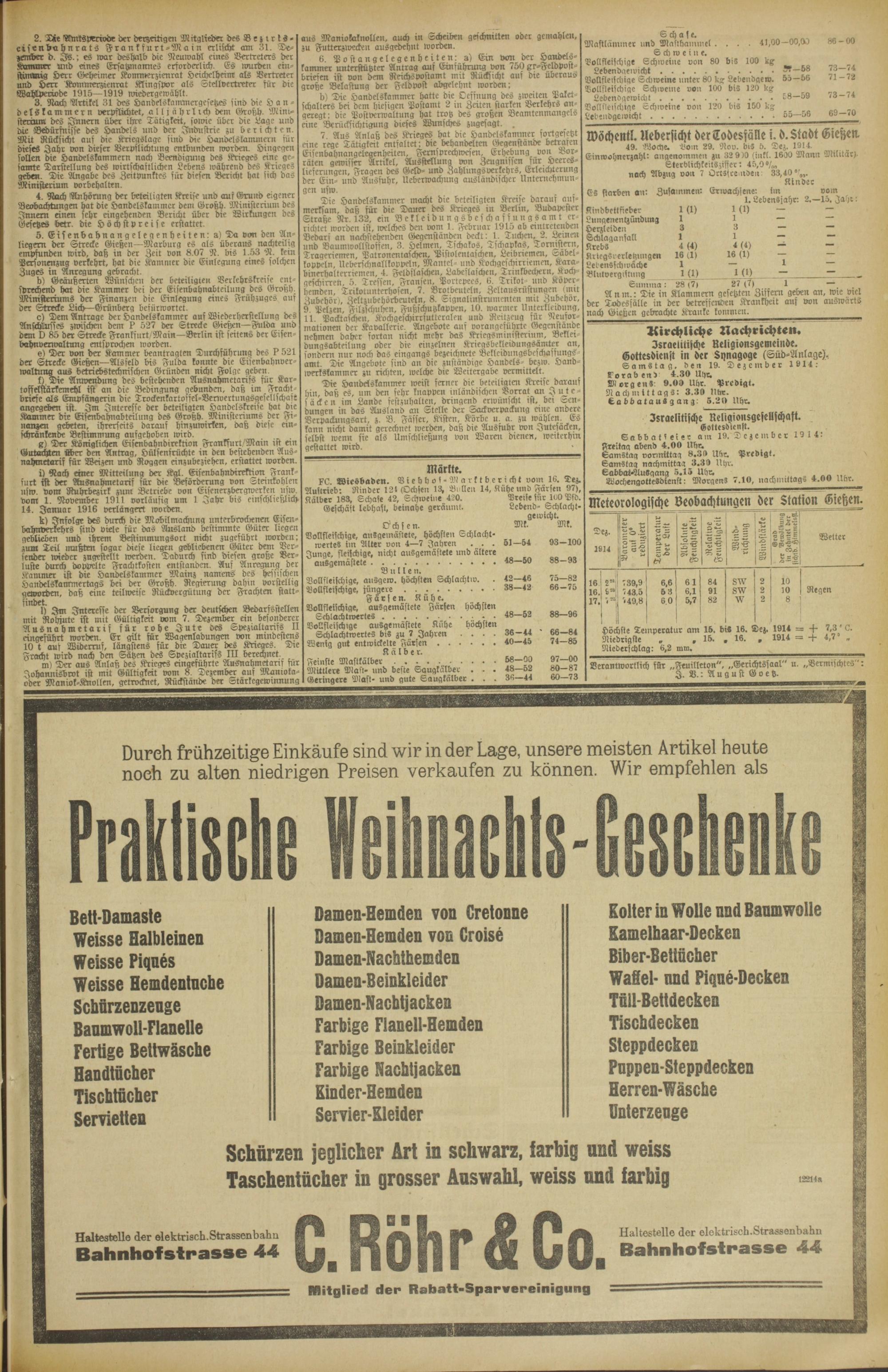 49. Woche. Dom 29. Nov. b>; 5. Dez. 1914. Einwohnerzahl: angenoinnien zu 32 9)0 (tuf(. 1600 Mann Militär). Sterblichkeilsziffer: 4f>,9°/„„ noch Abzug von 7 Ortsfremden 33,40°:,,.