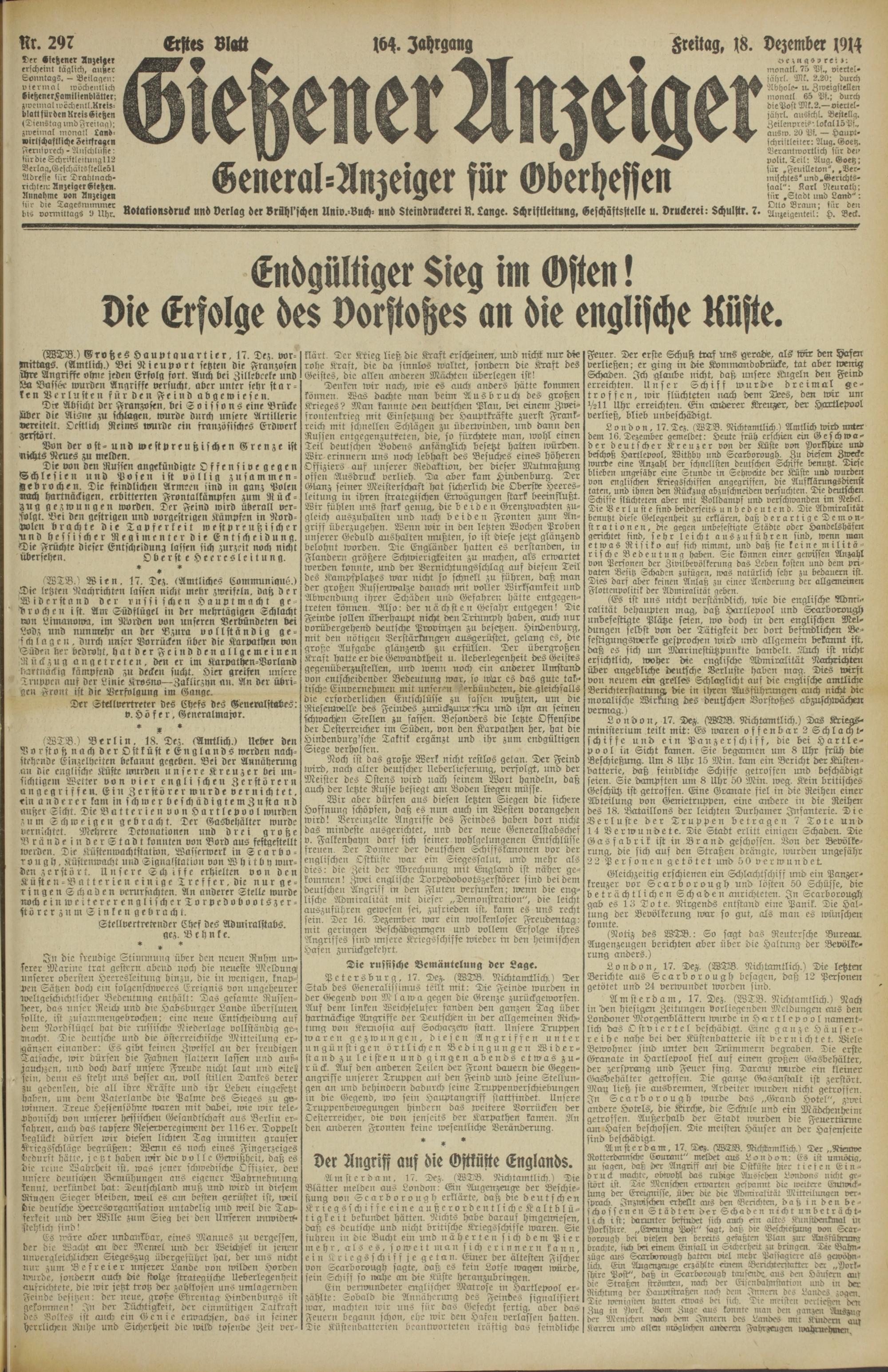 Wir aber dürfen aus diesen letzten Siegen die sichere Hoffnung schöpfen, daß es nun auch im Westen vorangehen wird! Vereinzelte Angriffe des Feindes haben dort nicht das mindeste ausgerichtet, und der neue Generalstabschef v. Falkenhayn darf sich seiner wohlgelunaenen Entschlüsse freuen. Der Donner der deutschen Schiffsranonen vor der englischen Ostküste war ein Siegessalnt, und mehr als dies: die Zeit der Abrechnung mit England ist näher ge-> kommen! Zwei englische Torpedobootszerstörer sind bei dem deutschen Angriff in den Fluten versunken; wenn die englische Admiralität mit dieser „Demonstration", die leicht auszuführen gewesen sei, zufrieden ist, kann es uns recht sein. Der 16. Dezember war ein wolkenloser Freudentag,: mit geringen Beschädigungen und vollem Erfolge ihres Angriffes sind imsere Kriegsschiffe wieder in den heimischen Hafen znrnckgekehrt.