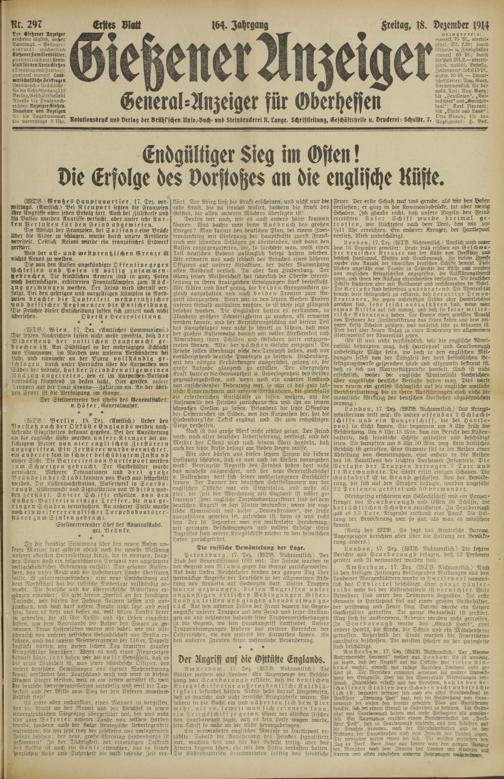 Gleichzeitig erschienen ein Schlachtschiff und ein Panzerkreuzer vor Scarborough und lösten 50 Schüsse, die beträchtlichen Schaden anrichteten, In Scarborough gab es 13 Tote. Nirgends entstand eine Panik. Die Haltung der Bevölkerung war so gut, als man es wünschen: konnte.