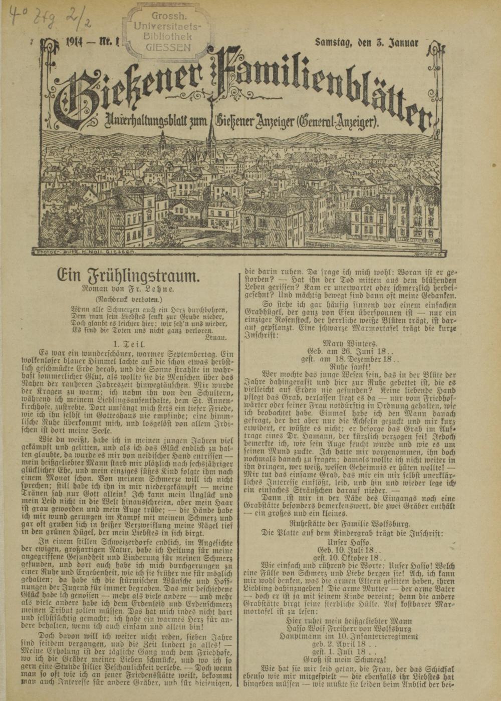 Doch davon will ich Iveiter nicht reden, sieben Jahre sind seitdem vergangen, und die Zeit lindert ja alles! — Meine Erholung ist der tägliche Gang nach dem Friedhofe, wo ich die Gräber meiner Lieben schmücke, und wo ich so gern eine Stunde stiller Beschaulichkeit verlebe. — Doch wenn man so oft wie ich an jener Friedensstätte iveilt, bekommt mau auch Interesse für andere Gräber, und für dieienigen,