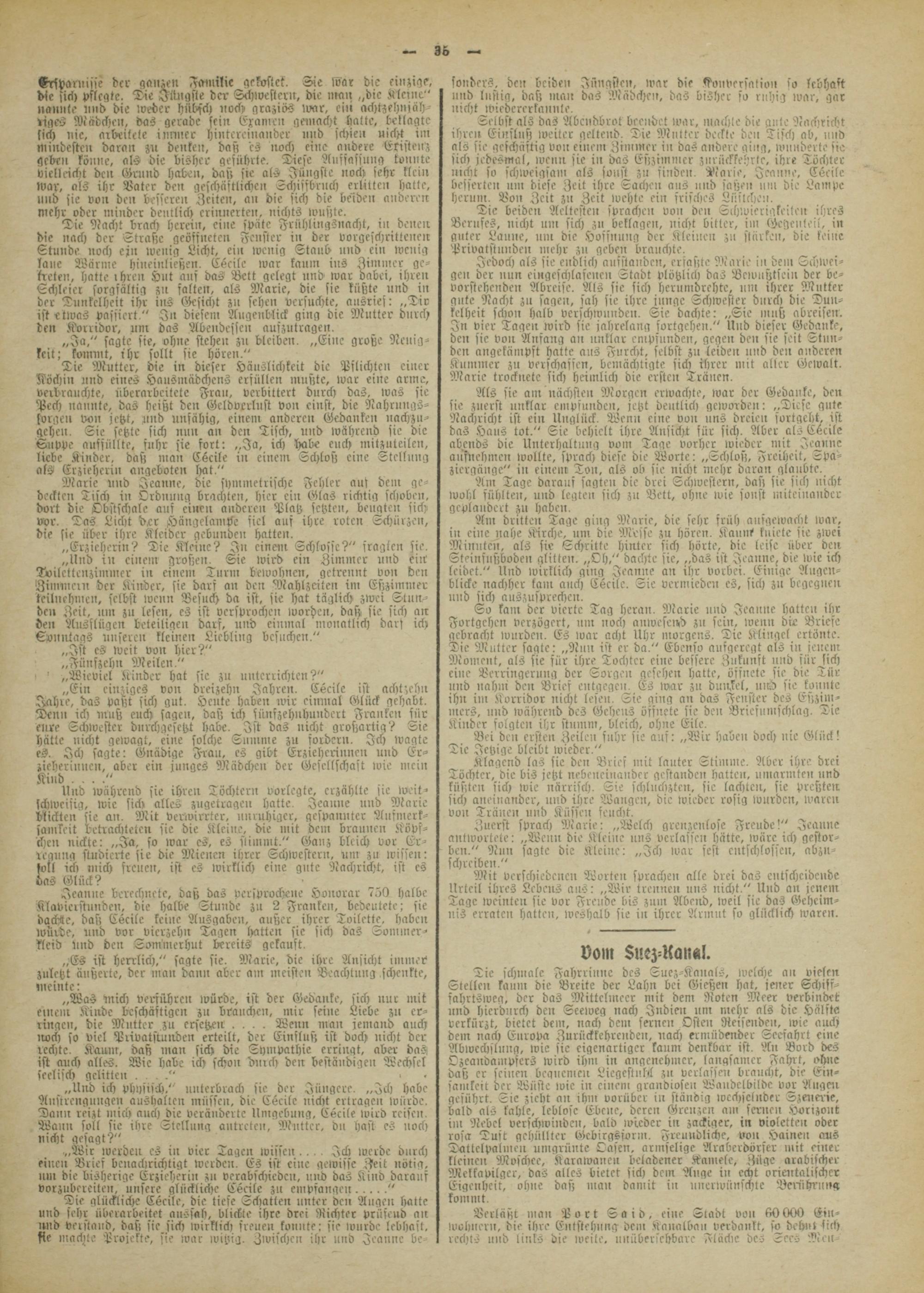 Tie Mutter, die in dieser Häuslichkeit die Pflichten einer Köchin und eines Hausmädchens erfüllen mußte, ivar eine arme, verbrauchte, überarbeitete Frau, verbittert durch das, ivas sie Pech nannte, das heißt den Geldverlust von einst, die NahrungS- sorgcn von jetzt, und unfähig, einen! anderen Gedanke» nachzn- gehen. Sie setzte sich nun an den Tisch, und während sie die Suppe aussüllte, fuhr sie fort; „Ja, ich habe euch mitzuteilen, liebe Kinder, daß man Cßcile in einem Schloß eine Stellitng als Erzieherin angcboten hat."