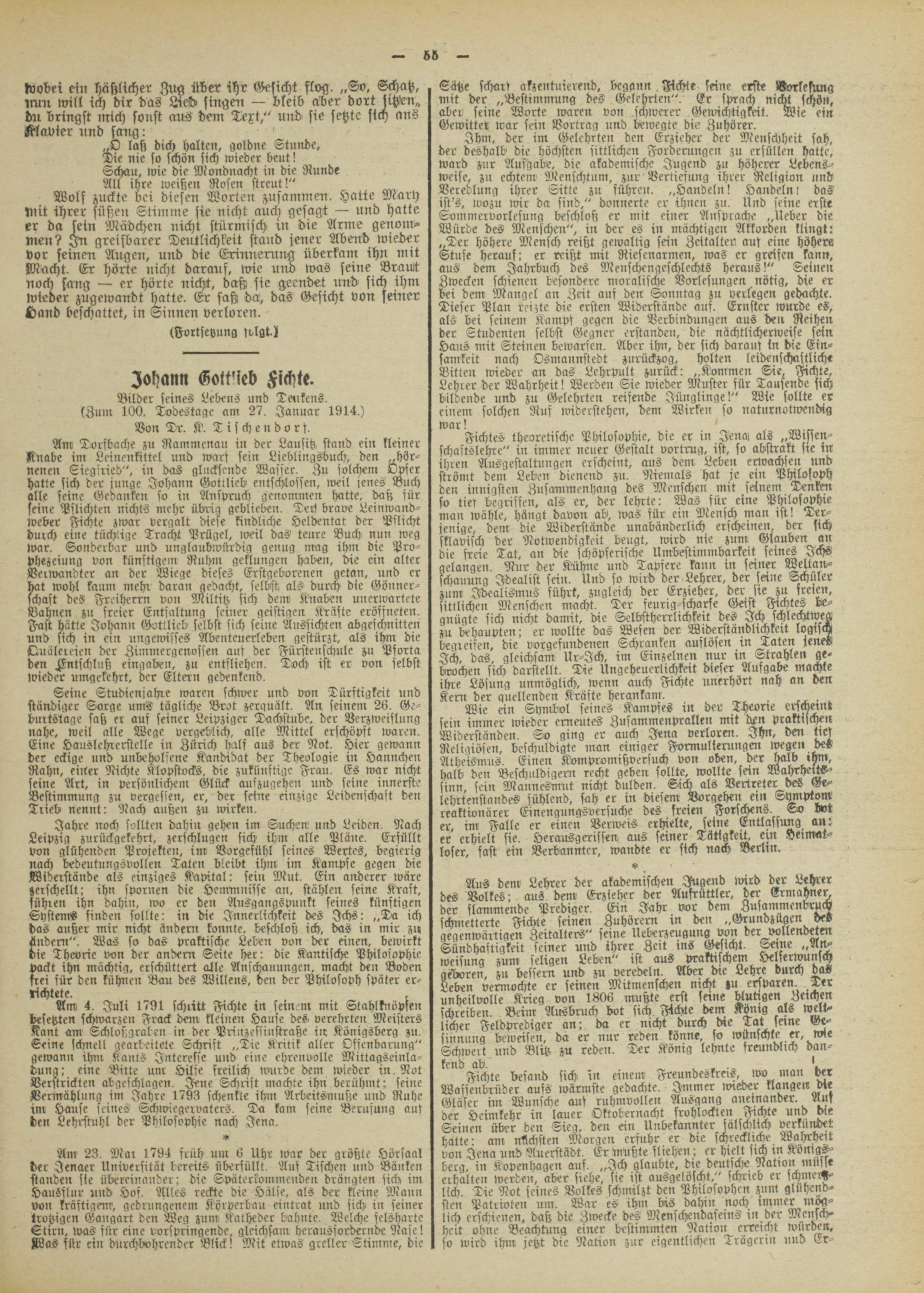Am Torsbache zu Rammenau in der Lausitz, stand ein kleiner Knabe im Leinenkittel und n>ars sein Lieblingsbuch, den „hör- nenen Siegsried", in das glucksende Wasser. Zu solchen! Opfer hatte sich der junge Johann Gottlieb entschlossen, weil jenes Buch alle seine Gedanken so in Anspruch genommen hatte, daß sür seine Pflichten nichts mehr übrig geblieben. Teck brave Leinwand- Weber Fichte zwar vergalt diese kindlich« Heldentat der Pflicht durch eine tüchtige Tracht Prügel, tveil das teure Buch nun weg war. Sonderbar und unglaubwürdig genug mag ihm die Prophezeiung von künftigem Ruhm geklungen haben, die ein alter Verwandter an der Wiege dieses Erstgeborenen getan, und er bat wohl kaum mehr daran gedacht, selbst als durch die Gönnerschaft des Frciherrn von Miltitz sich dem Knaben unerwartete Bahnen zu freier Entfaltung seiner geistigen Kräfte eröfsneten. Fast hätte Johann Gottlieb selbst sich seine Aussichten abgeschnittcn und sich in ein ungewisses Abenteuerleben gestürzt, als ihm die Ttuälercicn der Zimmergenossen aus der Fürstenschule zu Psorta den Fntschluß eingaben, zu entfliehen. Doch ist er von selbst Ivieder umgekehrt, der Eltern gedenkend.