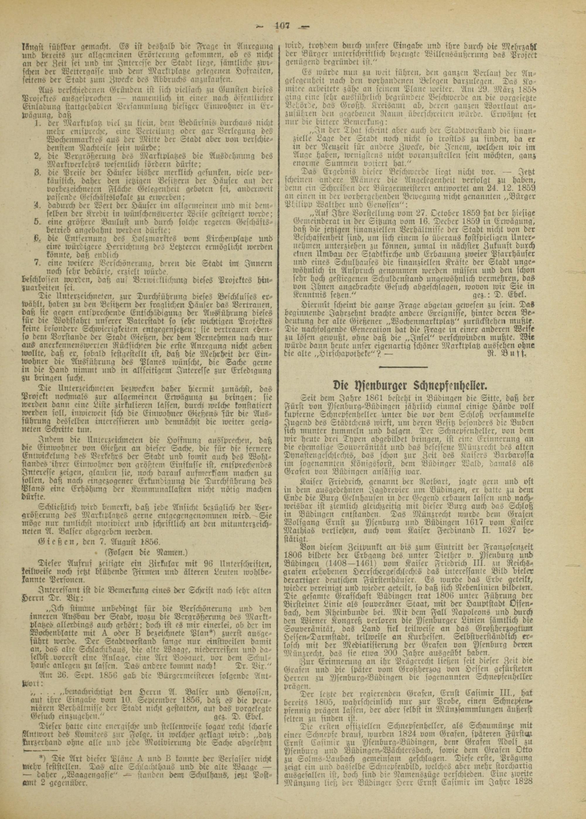 Hiermit scheint die ganze Frage abgetan gewesen zu sein. Das beginnende Jahrzehnt brachte andere Ereignisse, hinter deren Bedeutung der alte Gießener „Wochenmarktplatz" zurückstehen mußte. Die nachfolgend« Generation hat die Frage in einer anderen Weise zu lösen gewußt, ohne daß die „Insel" verschwinden mußte. Wie würde daun heute unser eigenartig schöner Marktplatz aussehen ohne die alte „Hirschapotheke" ? — R, Buff,