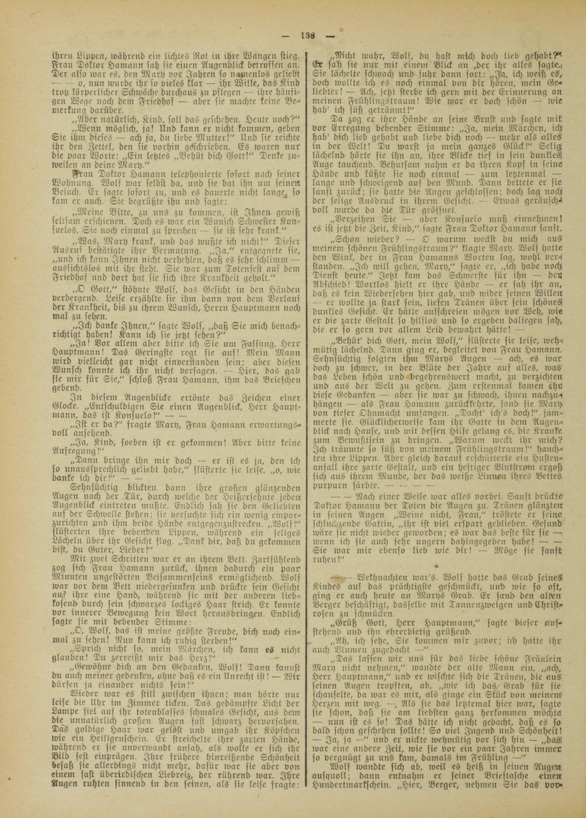„O Gott," stöhnte Wolf, das Gesicht in den Händen verbergend. Leise erzählte sie ihm dann von dem Verlauf der Krankheit, bis zu ihrem Wunsch, Herrn Hauptmann noch mal zu sehen.