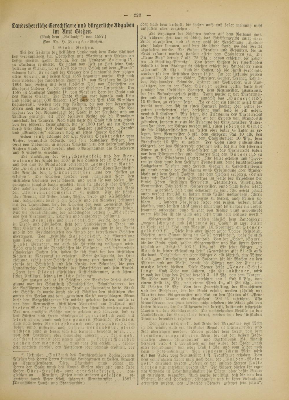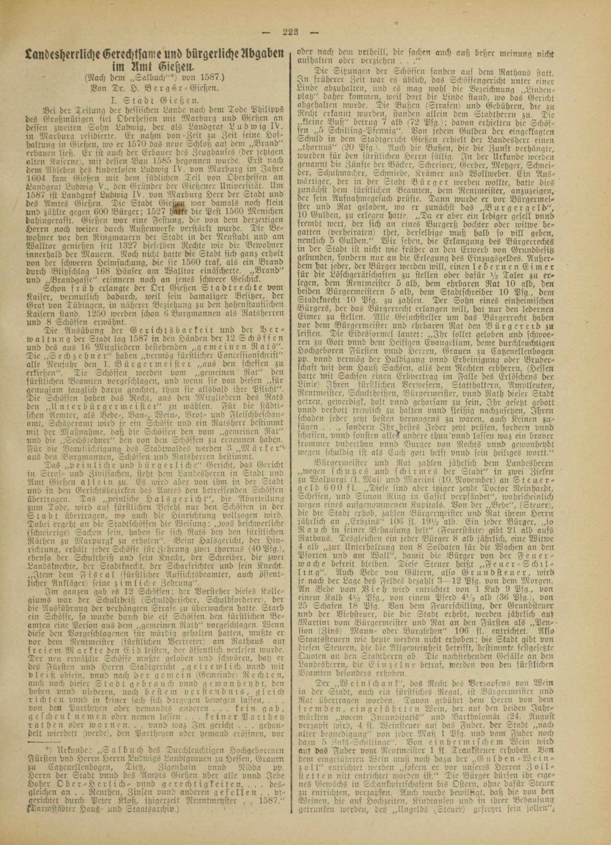*) Urkunde: „2 albuch des Durchleuchtigcn Hochgeborenen Fürsten vnd Herrn Herrn Ludwigs Landtgraucn zu Hessen, Grauen zu Catzenellenbogcn, Tietz, Zigenhain vnnd Nidda pp. Herrn der Stadt vnnd des Ämpts Gießen über alle vnnd Jede Hoher Obcr-Herlich- vnnd gerechtigkeiten, . . . desgleichen an . . Reuthen, Zinsen vnnd anderen gesellen . . vf- gerichtet durch Peter Kloß, itzigerzeit Renntmeyster . . 1587." kTarmstädter Haus und Staatsarchiv.)