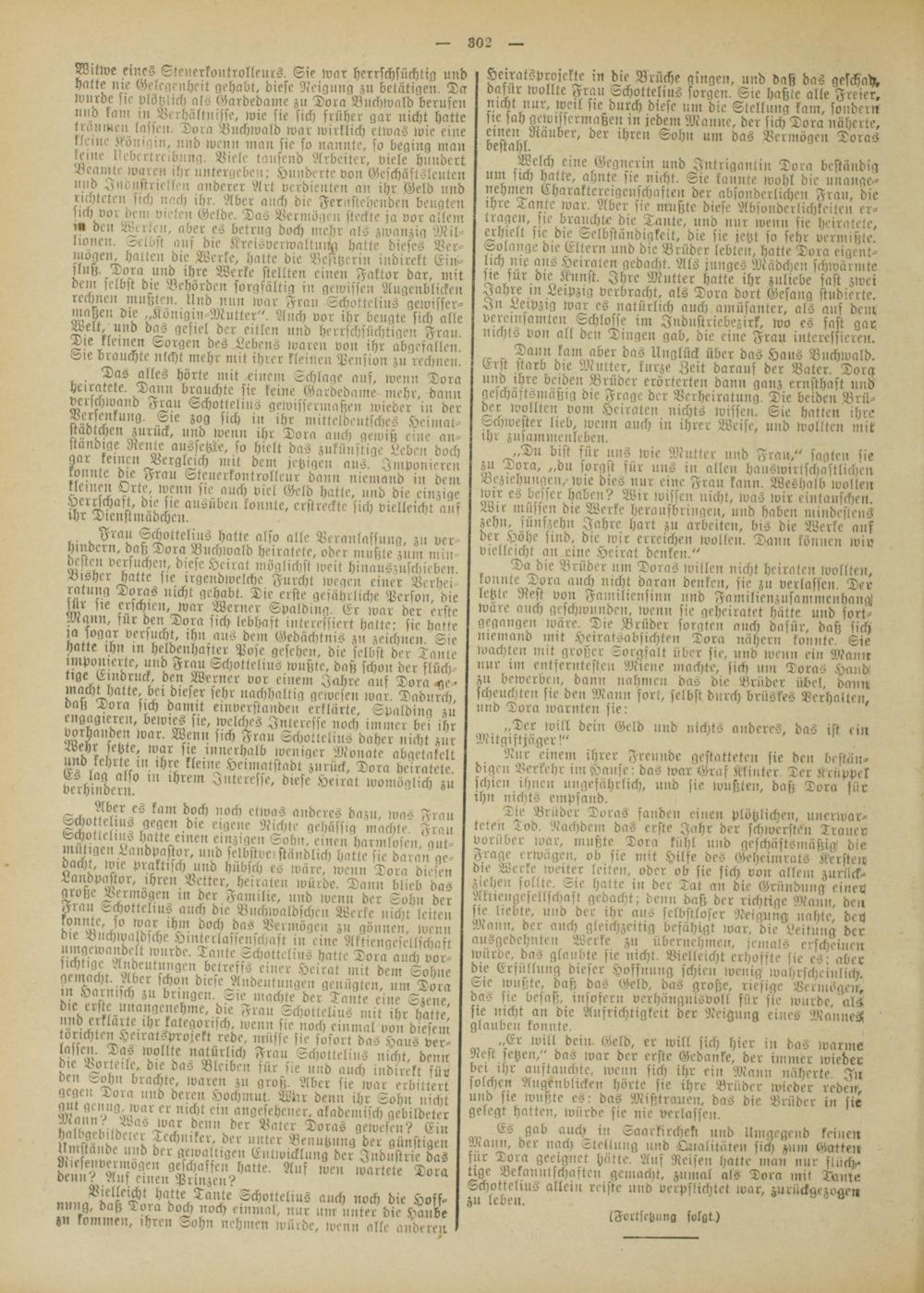 Aber cs kam doch noch etwas anderes dazu, was Frau Schottelins gegen die eigene Nichte gehässig machte. Frau Schottelins hatte einen einzigen Sohn, einen harmlosen, gutmütigen Landpastor, und selbstverständlich hatte sic daran gedacht, wie praktisch und hübsch es wäre, wenn Tora diesen Landpastor, ihren Vetter, heiraten würde. Dann blieb das große Vermögen in der Familie, und lvcn» der Sohn der Frau Schottelins auch die Bnchwaldschcn Werke nicht leiten konnte, so war ihm doch das Vermögen zu gönnen, wenn die Buchwaldsche Hinterlassenschaft in eine Aktiengesellschaft umgewandelt wurde. Tante Schottelins hatte Dora auch vorsichtige Andeutungen betreffs einer Heirat mit dem Sohne gemacht. Aber schon diese Andeutungen genügten, um Dora in Harnisch zu bringen. Sie machte der Tante eine Szene, die erste unangenehme, die Frau Schottelius mit ihr hatte, »nd erklärte ihr kategorisch, wenn sie noch einmal von diesem törichten Heiratsprojekt rede, müsse sie sofort das Haus verlassen. Das wollte natürlich Frau Schottelins nicht, denn die Vorteile, die das Bleiben für sie und auch indirekt fü« den Sohn brachte, waren zu groß. Aber sie war erbittert gegen Tora und deren Hochmut. Wiar denn ihr Sohn nicht gut genug, war er nicht ein angesehener, akademisch gebildeter Mann? Was war denn der Vater Doras gewesen? Ein halbgebildeter Techniker, der unter Benutzung der günstigen kimstände und der gewaltigen Entlvicklung der Industrie das Rieseuvermögen geschasscn hatte. Auf wen wartete Dora denn? Auf einen Prinzen?