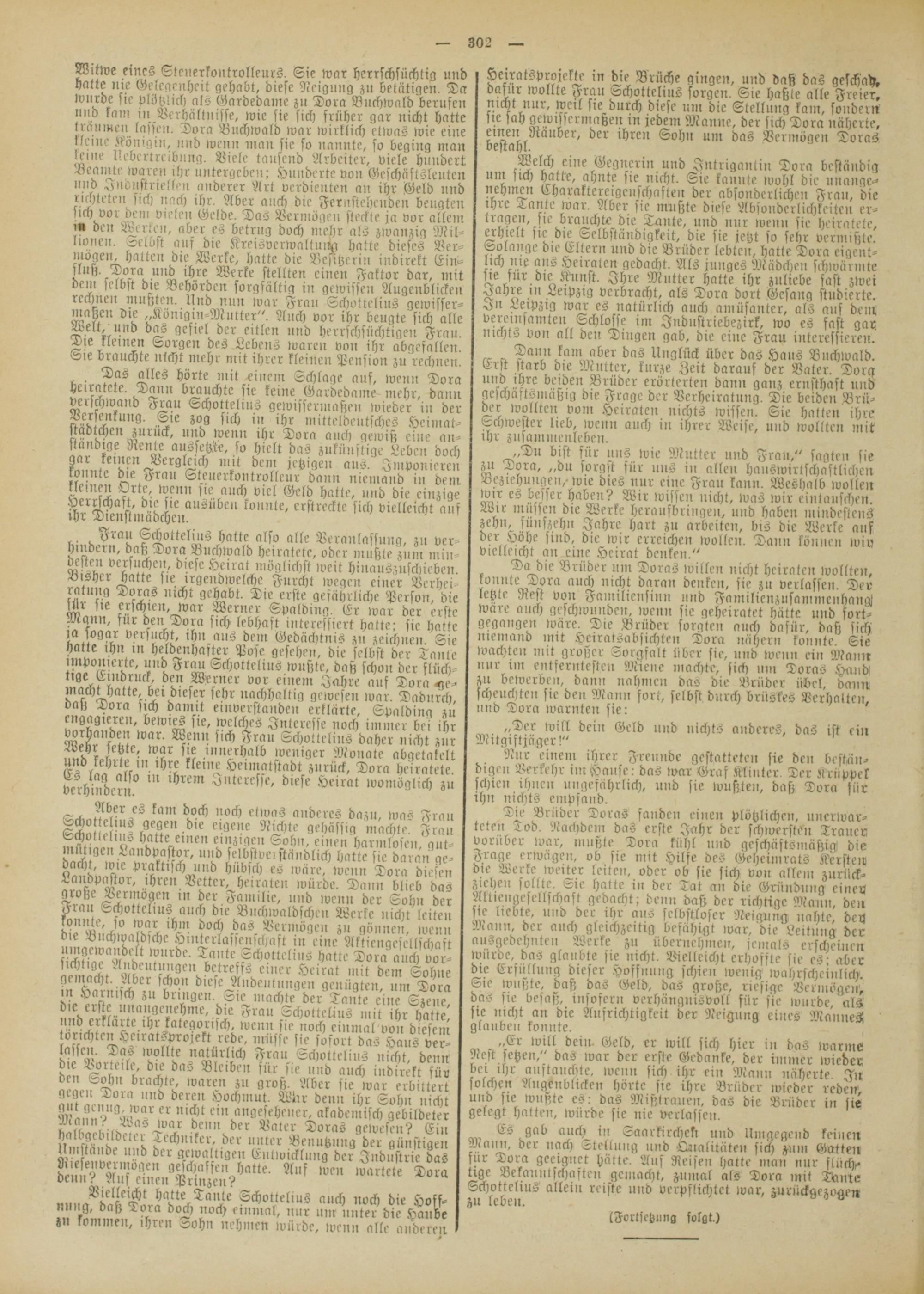 Daun kam aber das Unglück über das Haus Buchwald. Erst starb die Mutter, kurze Zeit darauf der Vater. Dorg und ihre beiden Brüder erörterten dann ganz ernsthast und geschäftsmäßig die Frage der Verheiratung. Tie beiden Brüder »rollten vom Heiraten nichts wissen. Sie hatten ihre Schwester lieb, wenn auch in ihrer Weise, und wollten mit ihr znsammenleben.