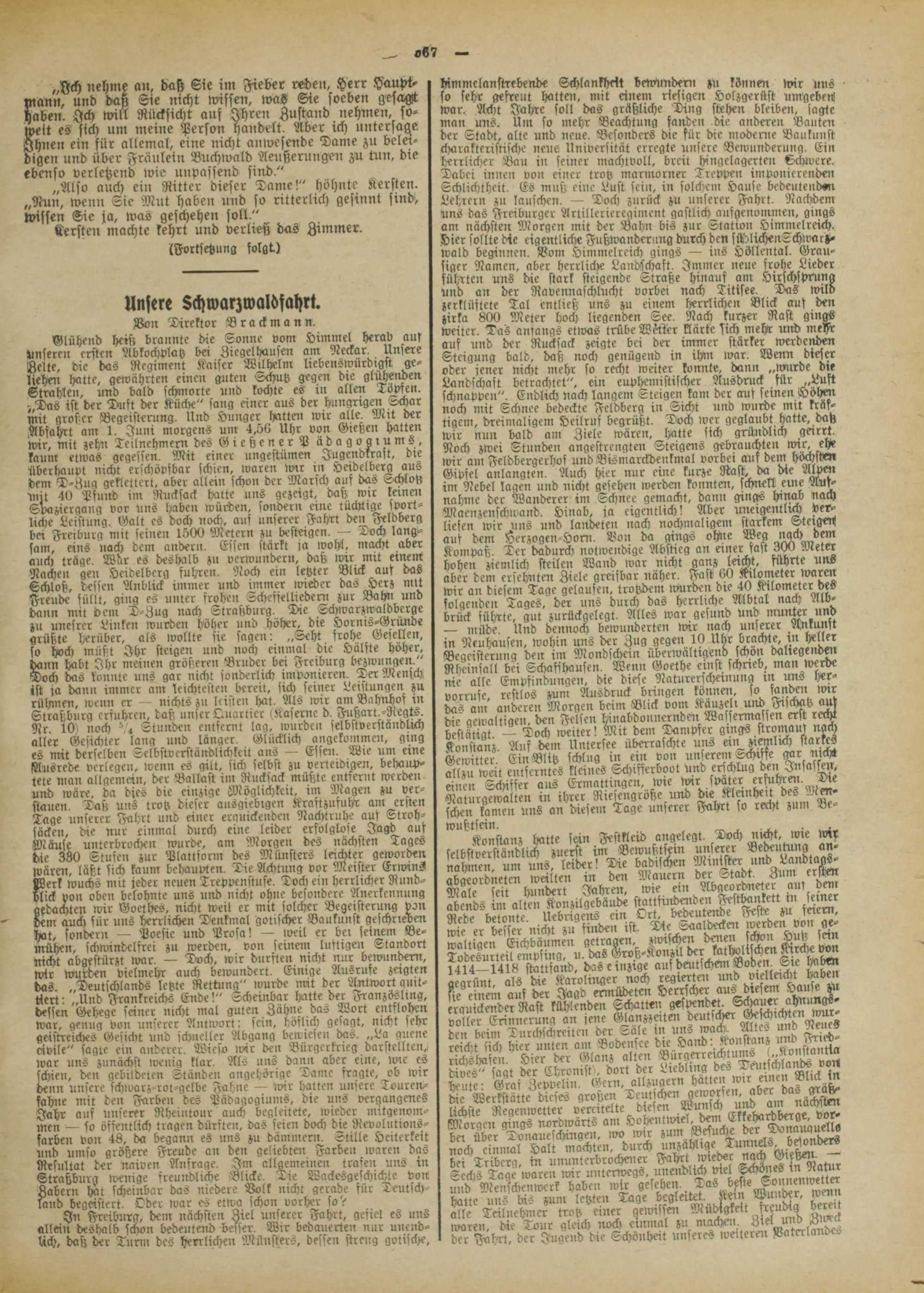 Konstanz hatte sein FestNeid angelegt. Doch nicht, lvie wir selbstverständlich zuerst im Bewußtsein unserer Bedeuttmg an- nahmen, um uns, leider! Die badischen Minister und Landtags- abgeordneten weiltm in dm Mauern der Stadt. Zum erstm Male seit hundert Jahren, wie ein Wgeordneter au, dem abends im alten Konzilgebäude stattfindmden Festbankett in seiner Rede betonte. Uebrigens ein Ort. bedeutende Feste zu feiern, wie er besser nicht zu findm ist. Die Saaldeckm werden von gewaltigen Eichbäumen getragen, zwischm dmen schon Duß sem Todesurteil empfing, u. das Groß-Konzil der katholischen Kirche von 1414—1418 staltsand, das einzige auf deutschem Boden. Sre haben gegrünt, als die Karolinger noch regierten und vielleicht haben sie einem aus der Jagd ermüdetm Herrscher aus diesem Hause zu erauickmder Rast kühlenden Schalten gespendet. Schauer ahnungs- voller Erinnerung an jene Glanzzeiten deutscher Geschichten wurden beim Durchschreiten der Säle in uns wach. Altes und Neues reicht sich hier unten am Bodensce die Hand: Konstanz und Fried- richshascn. Hier der Glanz allen Bürgerreichtums 0>Kvnstantia dives" sagt der Chronist', dort der Liebling des Deutschlands voll heute: Gras Zcpvelin Gern, allzugern hätten wrr einen Blick in die Werkstätte dieses großen Teutschm geworfen, aber das gräßlichste Regenwetler vereitelte diesen Wunsch und am nächsten Morgen gings nordwärts am Hohmtwiel, dem Ekkehordberge, vor- ber über Tvnaucschmgen, wo wir zum Besuche der Donauguells noch einmal Halt machten, durch unzählige Tunnels besonders bei Tribcrg, in ununterbrochmer Fahrt wieder nach Gießew — Sechs Tage wareii wir imlerwcgs, unendlich viel Schöiies in Natur und Menschenwerk haben wir gesehen. Das best« Tonnmwetter hatte uns bis zum letzten Tage begleitet. Kern Wunder, wenn alle Teilnehmer trotz einer gewissen Müdigkeit freudig bereit waren, die Tour gleich noch einmal zu mache». Ziel und Ziveck der Fahrt, der Jugend die Schönheit unseres weilereii Vaterlandes