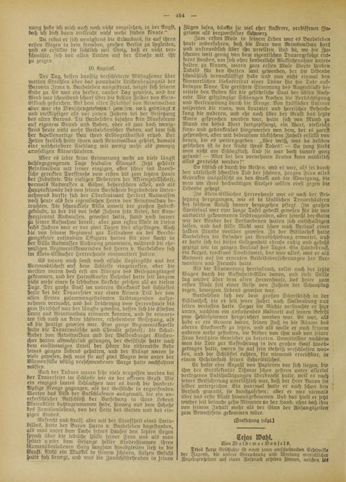 Es waren auch sonst noch etliche Logiergäste aus der Verwandtschaft aus dem Schlosse eingetrosfen, aber die Meisten waren doch erst am Morgen des Beisetzungstages gekommen, und der Harmsdorfer Bahnhof hatte seit langem Nicht mehr einen so lebhaften Verkehr gesehen als gn diesem Tage. Der große Saal im unteren Stockwerk des Schlosses hatte bei der Trauerfeier nur einen kleinen Teil der von allen Seiten zusammengeströmten Leidtragenden aufzunehmen vermocht, und der Lcicheuzug vom Herrenhause bis um Friedhof war der längste gewesen, dessen sich die ältesten tente aus Reinswaldau erinnern konnten, und sie erinnerten sich auch an keine schönere, erhebendere Beisetzung, als es die heutige gewesen war. Eine ganze Regimentskapelle hatte die Trauermärsche und Choräle gespielt; die Schulkinder von Reinswaldau und der Wawenburger Kirchenchor hatten abwechselnd gesungen, der Geistliche hatte nach dem einstimmigen Urteil der Hörer die rührendste Rede seines ganzen Lebens gehalten, und der Kränze waren so viele gewesen, daß man sie auf zwei Wagen dem unter der Blumenfülle völlig verschwundenen Sarge hatte nachsahren müssen.