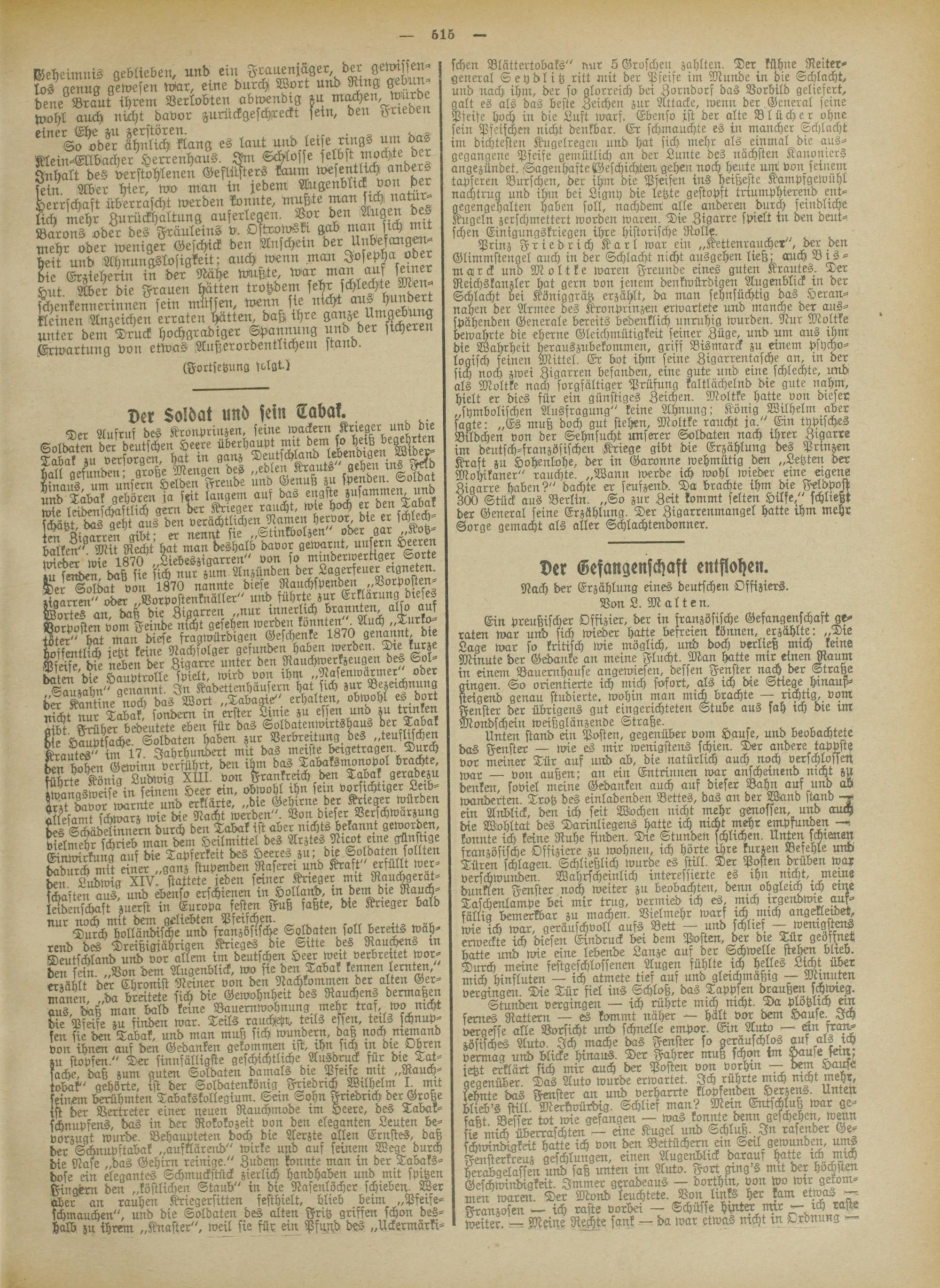 Prinz Friedrich Karl war ein „Kettenraucher", der den Glimmstengel auch in der Schlacht nicht ausgchen ließ: auch Bismarck und M o l t k e waren Freunde eines guten Krautes. Der Reichskanzler hat gern von jenem denkwürdigen Augenblick in der Schlacht bei Königgrätz erzählt, da man sehnsüchtig das Herannahen der Armee des Kronprinzen erwartete und manche der ausspähenden Generale bereits bedenklich unruhig wurden. Nur Moltke bewahrte die eherne Glcichmütigkeft seiner Züge, und um aus ihm die Wahrheit herauszubekommen, griff Bismarck zu einem psychologisch seinen Mittel. Er bot ihm seine Zigarrentasche an, in der sich noch zwei Zigarren befanden, eine gute und eine schlechte, und als Moltke nach sorgfältiger Prüfung kaltlächelnd die gute nahm, hielt er dies für ein günstiges Zeichen. Moltke hatte von dieser „symbolischen Aussragung" keine Ahnung: König Wilhelm aber sagte: „Es muß doch gut stehen, Moltke raucht ja." Ein typisches Bildchen von der Sehnsucht unserer Soldaten nach ihrer Zigarre im deutsch-französischen Kriege gibt die Erzählung des Prinzen Kraft zu Hohenlohe, der in Garonne wehmütig den „Letzten der Mohikaner" rauchte. „Wann werde ich wohl wieder eine eigene Zigarre haben?" dachte er seufzend. Da brachte ihm die Feldpost 300 Stück aus Berlin. „So zur Zeit kommt selten Hilfe," schließt der General seine Erzählung. Der Zigarrenmangcl hatte ihm mehr Sorge gemacht als aller Schlachtcndonner. -