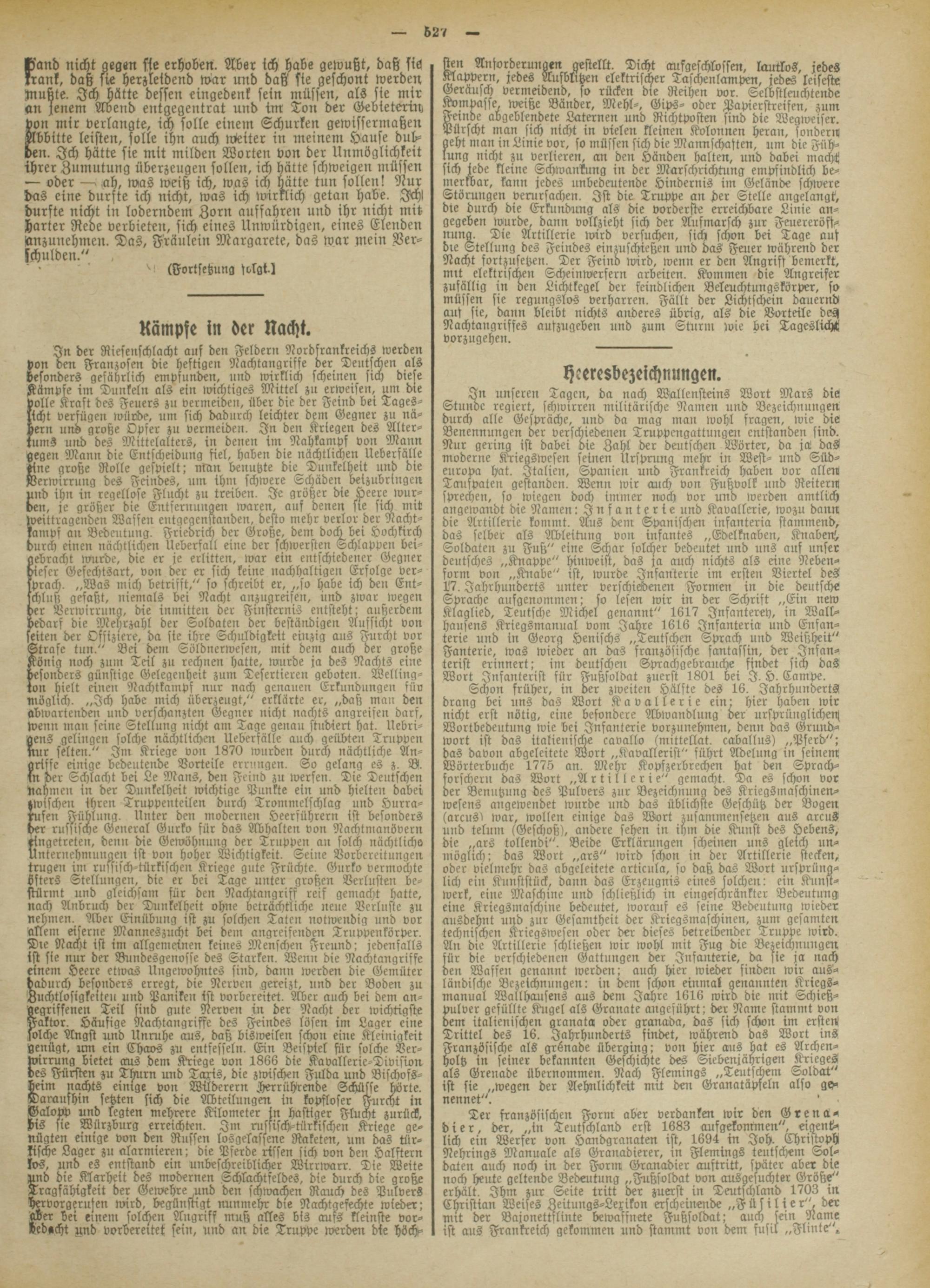 In der Riesenschlacht auf den Feldern Nordsrankreichs werden Von den Franzosen die heftigen Nachtangriffe der Deutschen als besonders gefährlich empfunden, und wirklich scheinen sich diese Kämpfe im Dunkeln als ein wichtiges Mittel zu erweisen, um die volle Kraft des Feuers zu vermeiden, über die der Feind bei Tageslicht verfügen wücke, um sich dadurch leichter dem Gegner zu nähern und große Opfer zu vermeiden. In den Kriegen des Altertums und des Mittelalters, in denen im Nahkampf von Mann gegen Mann die Entscheidung fiel, haben die nächtlichen Uebersälle »ine große Rolle gespielt: ntan benutzte die Dunkelheit und die Verwirrung des Feindes, um ihni schwere Schäden beizubringen und ihn in regellose Flucht zu treiben. Je größer die Leere wurden, je gröber die Entfernungen waren, auf denen sie sich mit weittragenden Waffen eutgegenstande», desto mehr verlor her Nachtkampf an Bedeutung. Friedrich der Große, dem doch bei Hochkirch durch einen nächtlichen Uebersall eine der schwersten Schlappen bei-