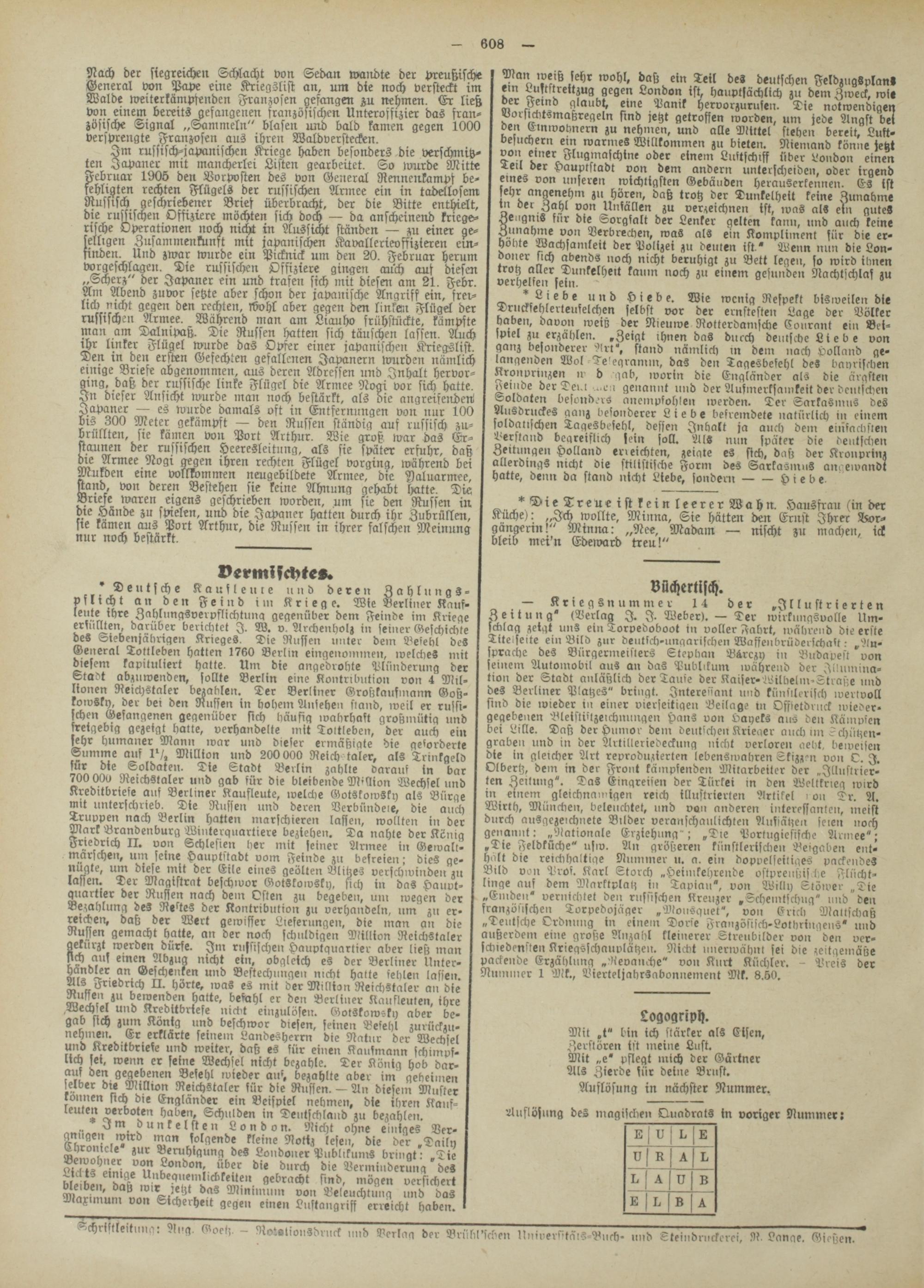 — Kriegsnummer 14 der »Illustrierten Zeitung' lBerlag I. I. Weberl. — Ter wirkuiigsvolle Umschlag zeigt uns ei» Torpedoboot in voller Fahrt, währeiid die erste Tite seite ein Bild zur deuilch-ungarischeii Waffenbrüderschaltr »Ansprache des Bürgermeisters Stephan Btlrczy in Budapest von seinem Automobil aus an das Publikum ivähreud der Filuinina» tion der Stadt anläßlich der Tauie der Kaiser-Wilbelm-Straß« und des Berliner Platzes" bringt. Jntcrenant »nd künstlerisch werivoll sind die wieder in einer vierseitigen Beilage in Offietdrnck wiedergegebenen Bleististzeichnungeu Hans von Hayeks ans den Kämpien bei Lille. Daß der Humor de»i deutlchcn Krieger auch im ö chützen- grabeii und in der Artilleriedecknng nicht verloren gebt, beivcise» die in gleicher Art reproduzierten lebenswahren Skizzni von O. I. Olberh, dein in der Front käinpsende» Mitarbeiter der „Illustrierten Zeitung". TaS Einqrcisen der Türkei in den Weltkrieg wird in einem gleichnamigen reich illustrierten Artikel > on Tr. 21. Wirth, München, beleuchtet, und vo>i anderen interestantcn, ineist diirch ausgezeichnete Bilder veranschaulichtcu 2luliätzen (neu noch genannt: „Nationale Erziehung ; »Tie Portugiesische Armee'; »Tie Feldküche" »sw. An gröbere» künstlerischen Beigaben enthalt die reichhaltige Nummer ». n. ei» doppelseitiges packendes Bild von Pro!. Karl Storch „Heimkehrende ostprenbis l.c Flüchtlinge aus dem Alarktplatz in Tapiau', von Willy Stöiver „Tie »Emden' veriiichtel bei, russische» Kreiizer »Schemtlchug" imb den französischen Torpedojäger »Monsqnet", voii Erich Mauschaß „Tentsche Ordnung in einein Dorie Französisch-Lothringens' und außerdem eine große 2 liizahl kleinerer Streubildcr von den verschiedenste» Kriegsschauplätzen. Nicht liiierwähni sei die zeitgeiiiäbe packende Erzähl,ing »Revanche" von Knrt Küchler. - Preis der Niunnier 1 'Sit., Vierteljahrsabonnement SDK. 8.50.