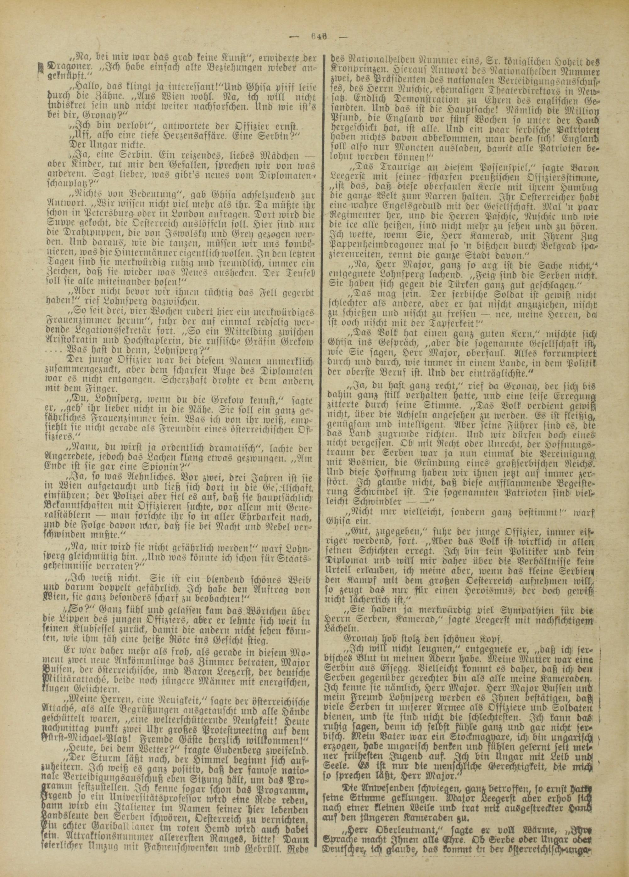 „Ja, eine Serbin. Ein reizendes, liebes Mädchen aber Kinder, tut mir den 'Gefallen, sprechen wir von was anderem. Sagt lieber, was gibt's neues vom Diplomaten-, schauplatz?"
