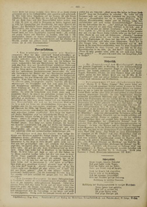 — Die „Tageschronik des Weltkrieges", Verlag von Heinrich Hugendnbel in München, ist eine Zlisanimenstelluttg der Kriegsereignisse jedes einzelnen Tages in ganz kurzen Merk- ,»orten. Das neulich erschienene erste Heft umsatzt die Monat« August, September, Oktober. In ihrer knappen Kürze und Handlichkeit, zumal bei dem billigen Preis von nur 20 Psg. ist di« „Tageschronik" nicht mir nnsern Soldaten im Feld zu empfehlen, sondern auch jedernianu als Merkbüchlein.