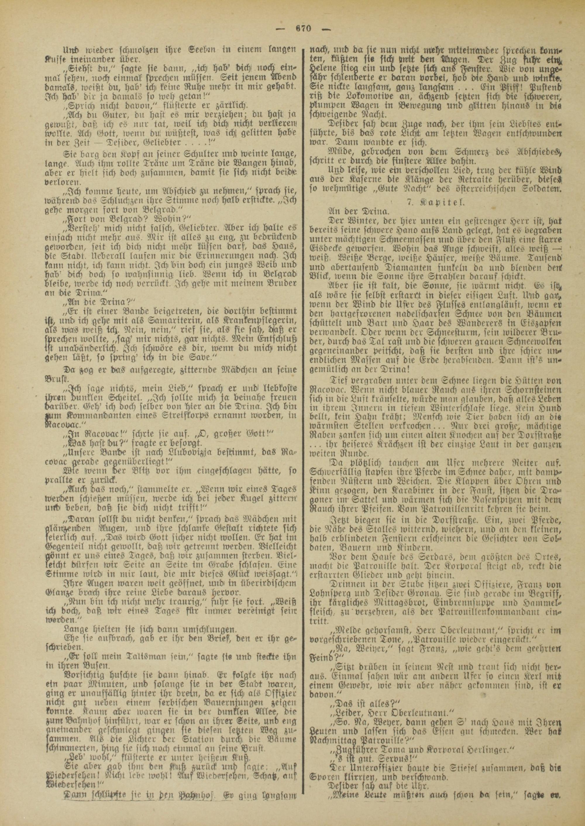 Vorsichtig huschte sie dann hinab. Gr folgte ihr nach ein paar Minuten, und solange sie in der Stadt waren, ging er unauffällig hinter ihr drein, da er sich als Offizier nicht gut neuen einem serbischen Bauernjungen zeigen konnte. Kam» aber waren sie in der dunklen Allee, die zum Bahnhof hinführt, war er schon an ihrer Sette, und eng aneinander geschmiegt gingen sie diesen letzten Weg zusammen. Als die Lichter ver Station durch die Bäume schimmerten, hiirg sie sich noch einmal an seine Brust.
