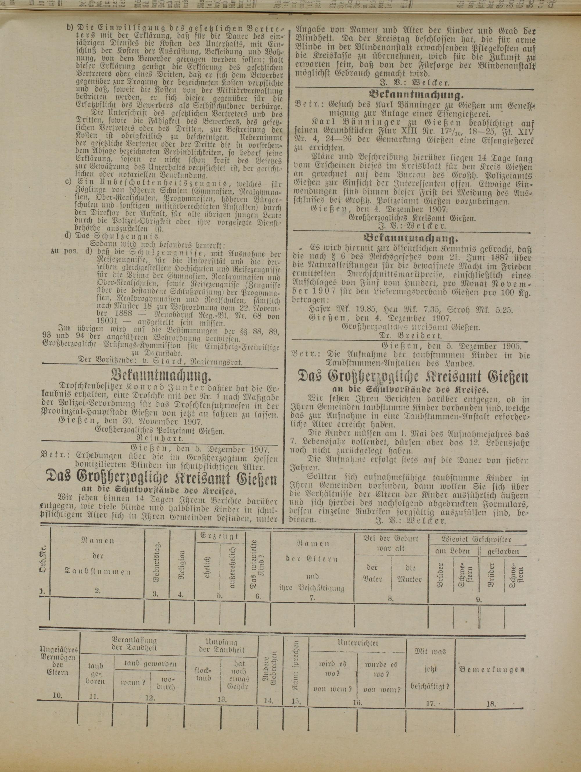 - Es wird hiermit zur öffentlichen Kenntnis gebracht, daß die nach § 6 des Reichsgesetzes vom 21. Juni 1887 über die Naturalleistungen für die bewaffnete Macht im Frieden erinittelten Durchschuittsmarktpreise, einschließlich eines Aufschlages von Fünf vom Hundert, pro Monat November 1907 für den Liefernngsverband Gießen pro 100 Kg. betragen: