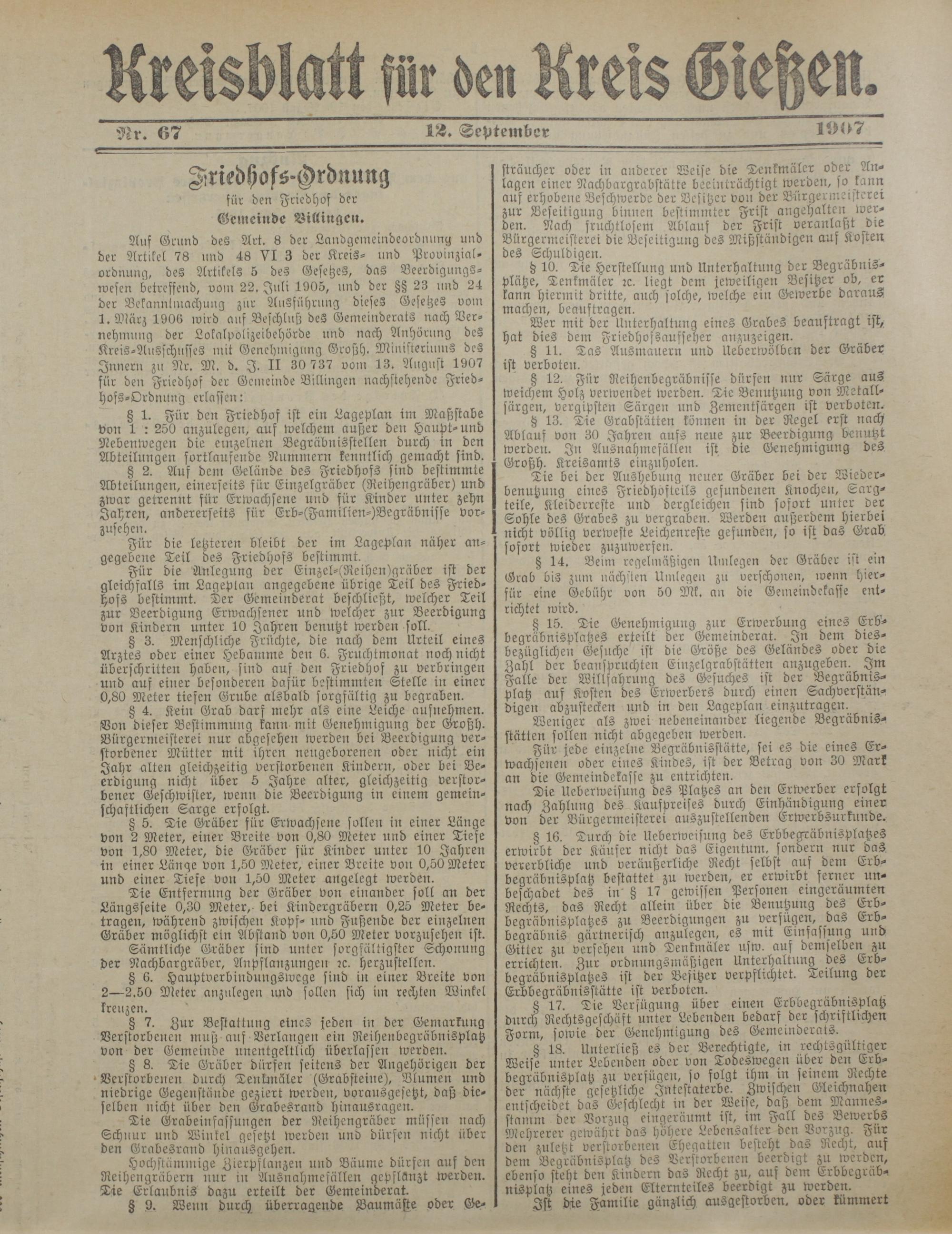 § 13. Tie Grabstätten können in der Regel erst nach Ablauf von 30 Jahren aufs neue zur Beerdigung benutzt werden. In Ausnahmefüllen ist die Genehmigung des Großh. Kreisamts einzuholen.