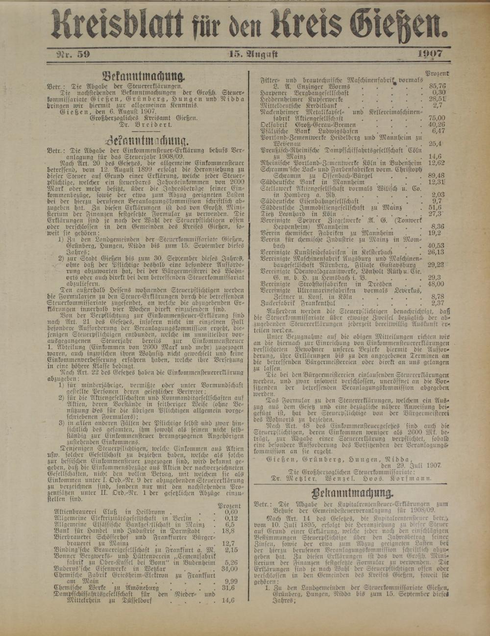 Tie nachstehenden Bekanntmachungen der Großh. Steuerkommissariate Gießen, Grünberg, Hungen und Nidda bringen wir hiermit zur allgemeinen Kenntnis.