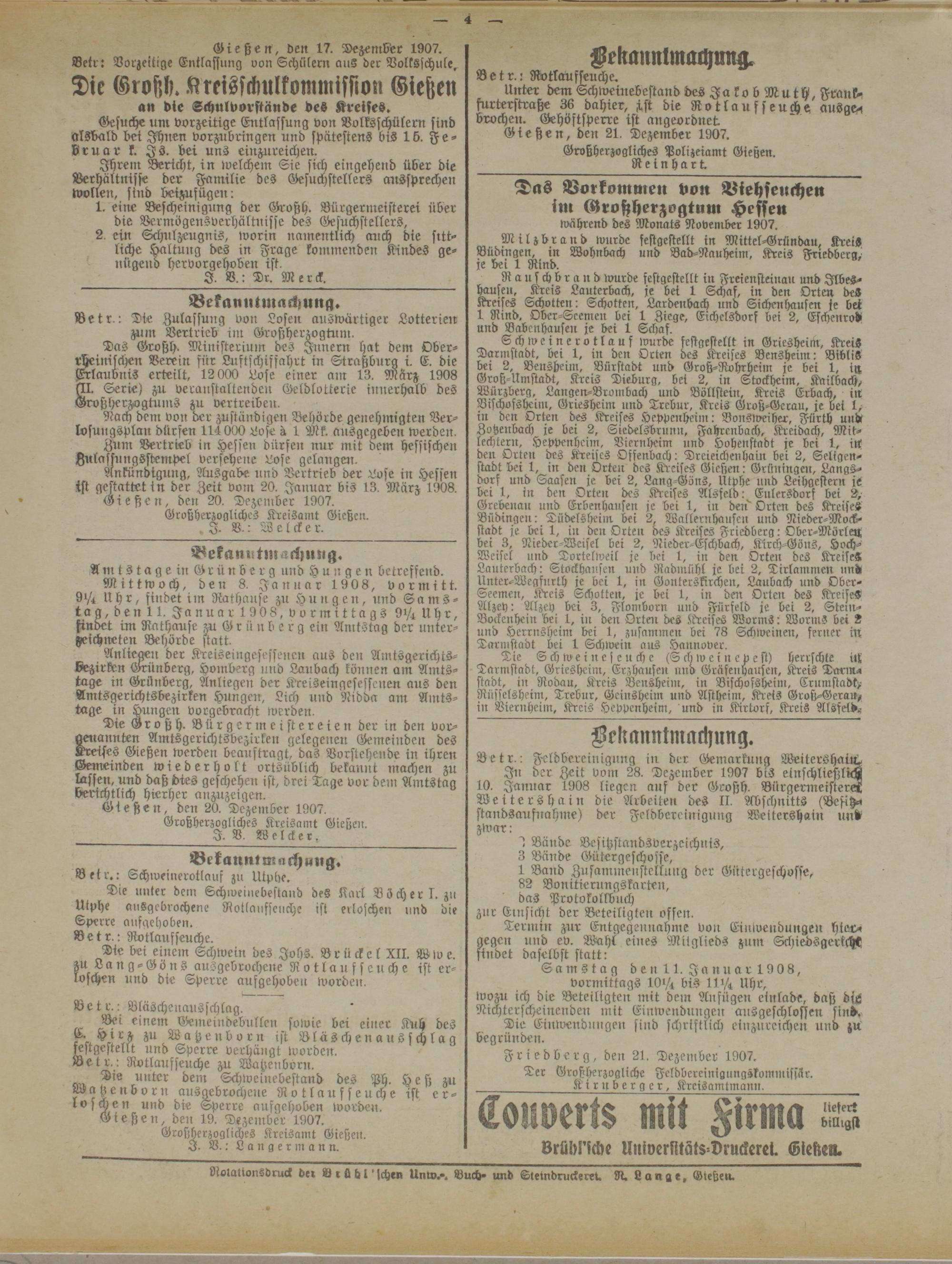 Gießen, den 17. Dezember 1907. Betr: Vorzeitige Entlassung von Schülern mi§ der Volksschule, Die Grossh. Kreisslimlkommission Gießen an die Schulvorstände des Kreises.