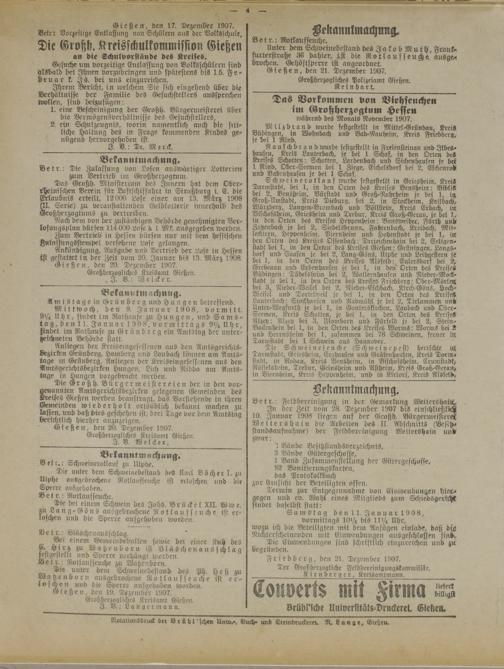 Die Großh. Bürgermeistereien der in den vor- aenannten Amtsgerichtsbezirken gelegenen Gemeirrden des Greises Gießen werden beauftragt, das Vorstehende in ihren Gemeinden wiederholt ortsüblich bekamtt machen zu lassen, und daß dies geschehen ist, drei Tage vor dem Amtstag Gerichtlich hierher anzuzeigen.