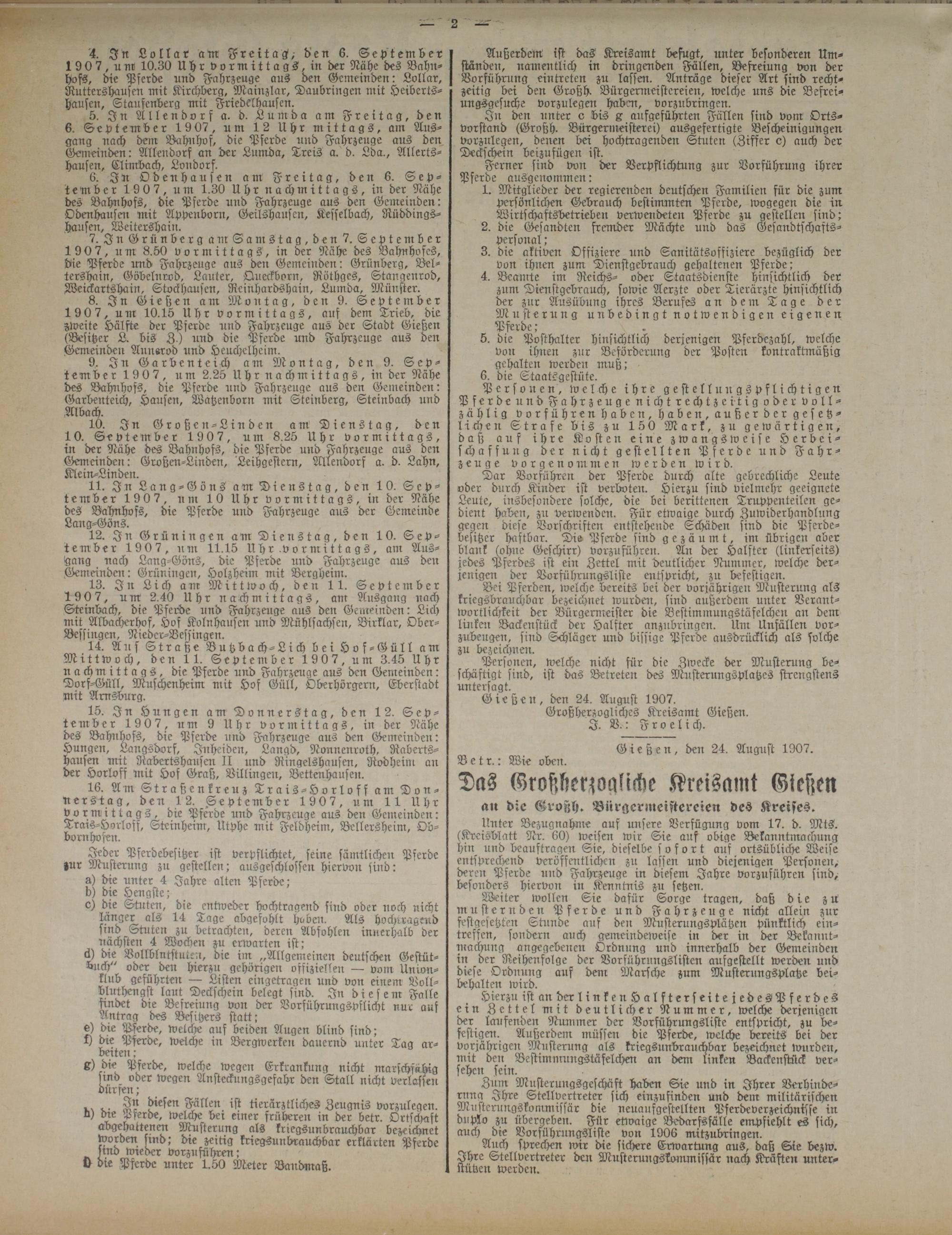 4. In Lollar am Freitag, den 6. September 1907, u m 10.30 Uhr vormittags, in der Nähe des Bahnhofs, die Pferde und Fahrzeuge aus den Gemeinden: Lollar, Ruttershausen mit Kirchberg, Mainzlar, Daubringen mit Heiberts- hausen, Staufenberg mit Friedclhausen.
