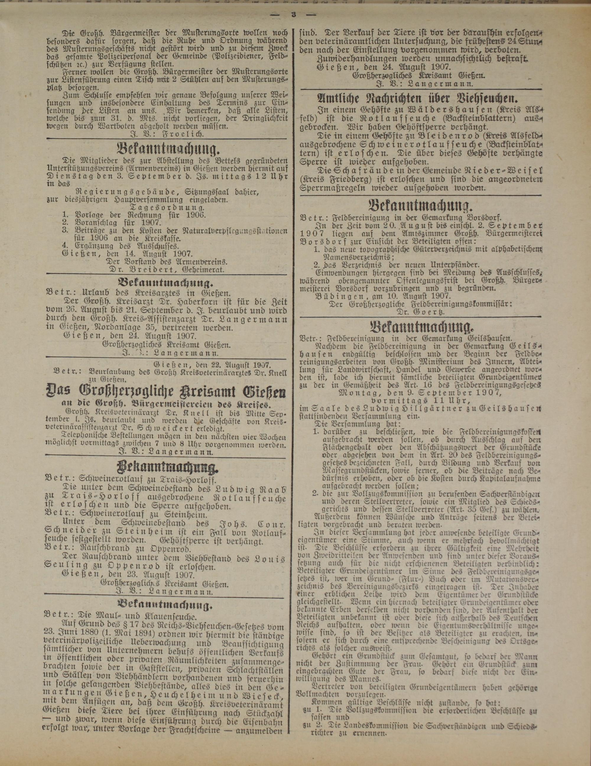 Zuwiderhandlungen werden unnachsichtlich bestraft. Gießen, den 24. August 1907.
