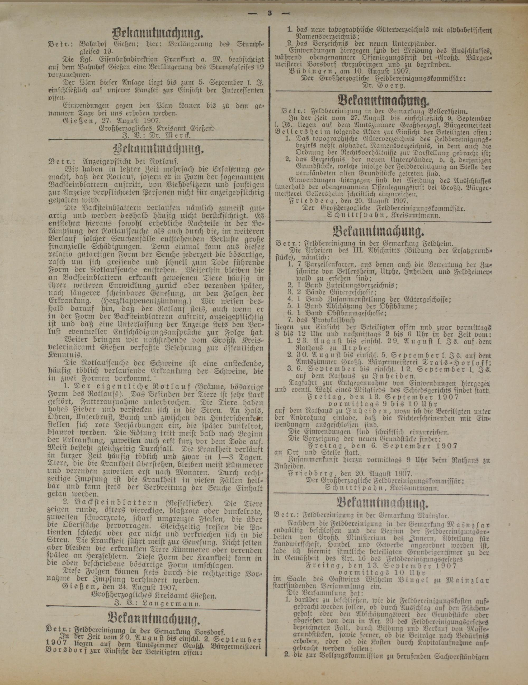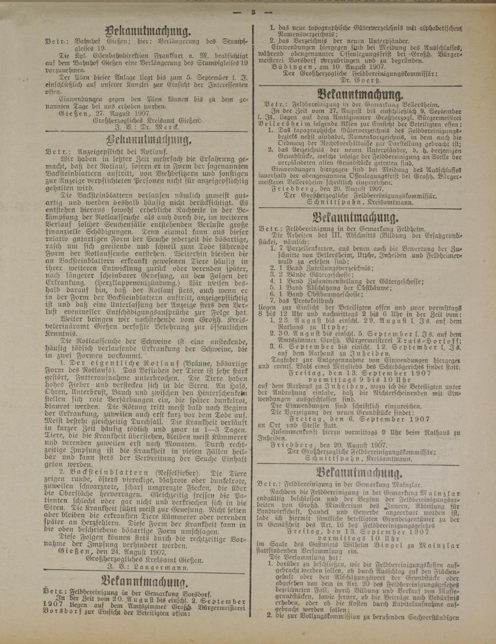 Nachdem die.Feldbereinigung in der Geinarkung Mainzlar endgültig beschlossen und der Beginn der Feldbereinigungsarbeiten von Großh. Ministerium des Innern, Abteilung für Landwirtschaft, Handel und Gewerbe angeordnet worden ist, lade ich hiermit sämtliche beteiligten Grundeigentünier zu der in Gemäßheit des Art. 16 des Feldbereinigungsgesetzes Freitag, den 13. Septeniber 1907