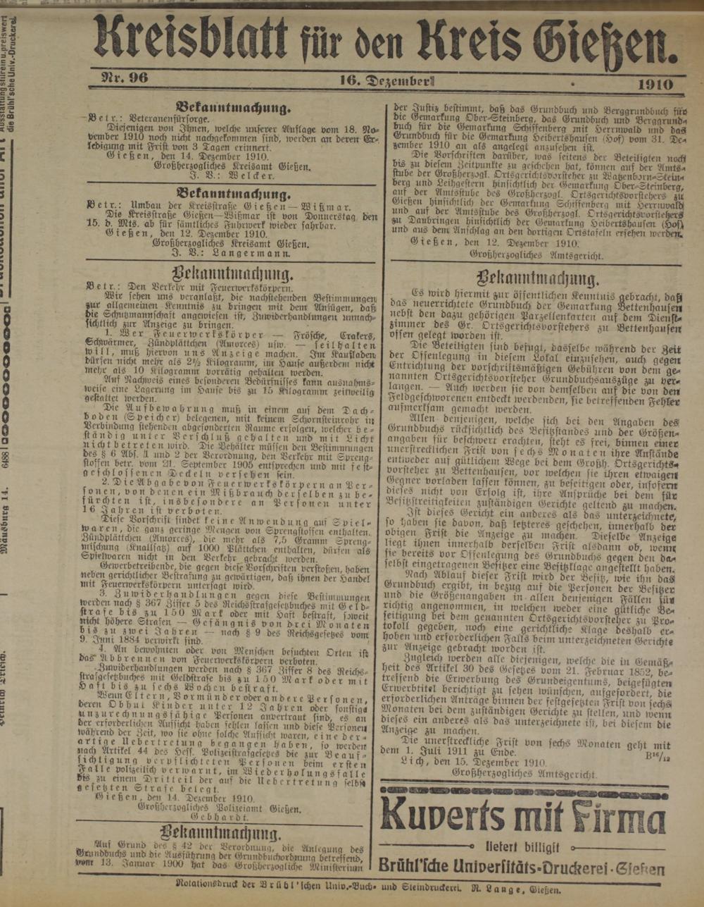 1. Wer Feuerwcrkskörper — Frösche, Craker«, Schivarmer, Zündplättchen (Amorces) usw. — seil halten will, muß hiervon uns Anzeige machen. Jin Kaufladen dürfen nicht mehr als 2% Kilogramm, im Hanse außerdem nicht Mehr als 10 Kilogramm vorrätig gehalten werden.