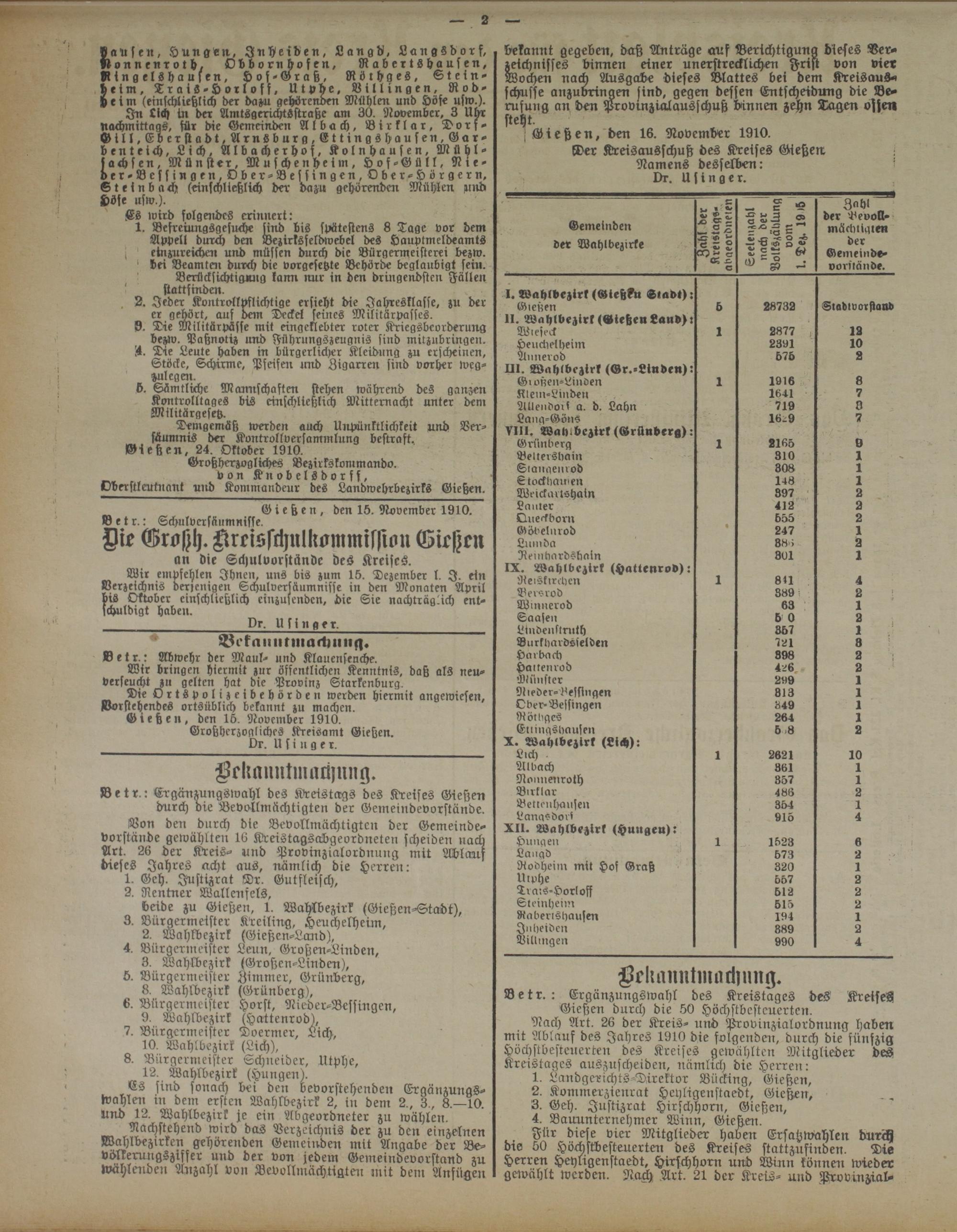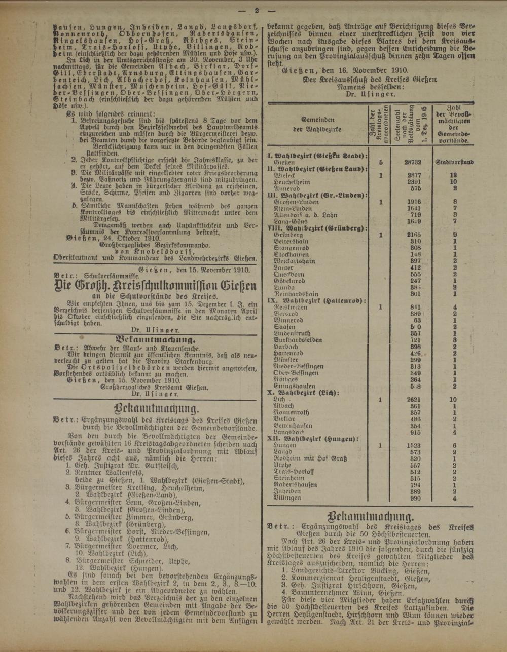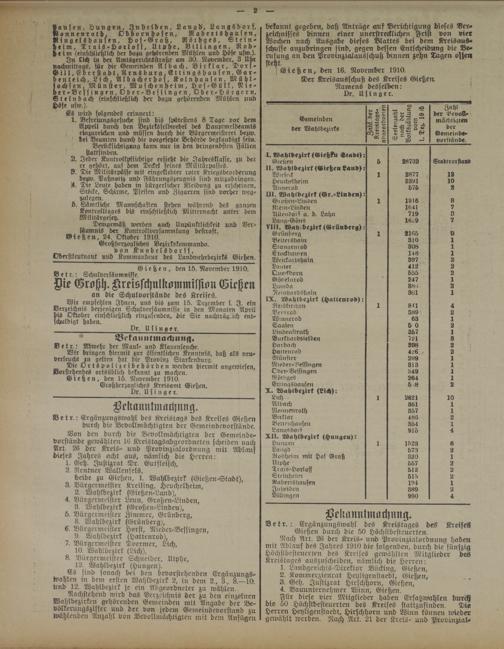In Lich in der AmtsgerichtSstraße am 30. November, 3 Uhr nachmittags, für die Gemeinden Albach, Birklar, Dorf- Gill, Eberstadt,Arnöburg,Ettingshausen,Garbenteich, Lich, Albacherhof, Kolnhausen, Mübl- lachsen, Münster, Müschen heim, Hof-Güll, Nie- oer-Bessingen, Ober- Bessingen, Ober-Hörgern, Steinbach (einschließlich der dazu gehörenden Mühlen iunb Höfe usw.).
