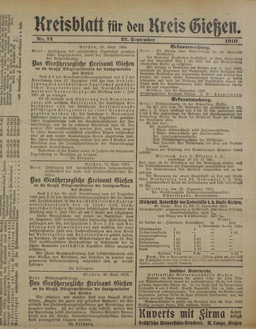 Großherzogliches Kreis amt Gießen. I. V.: Lang ermann.