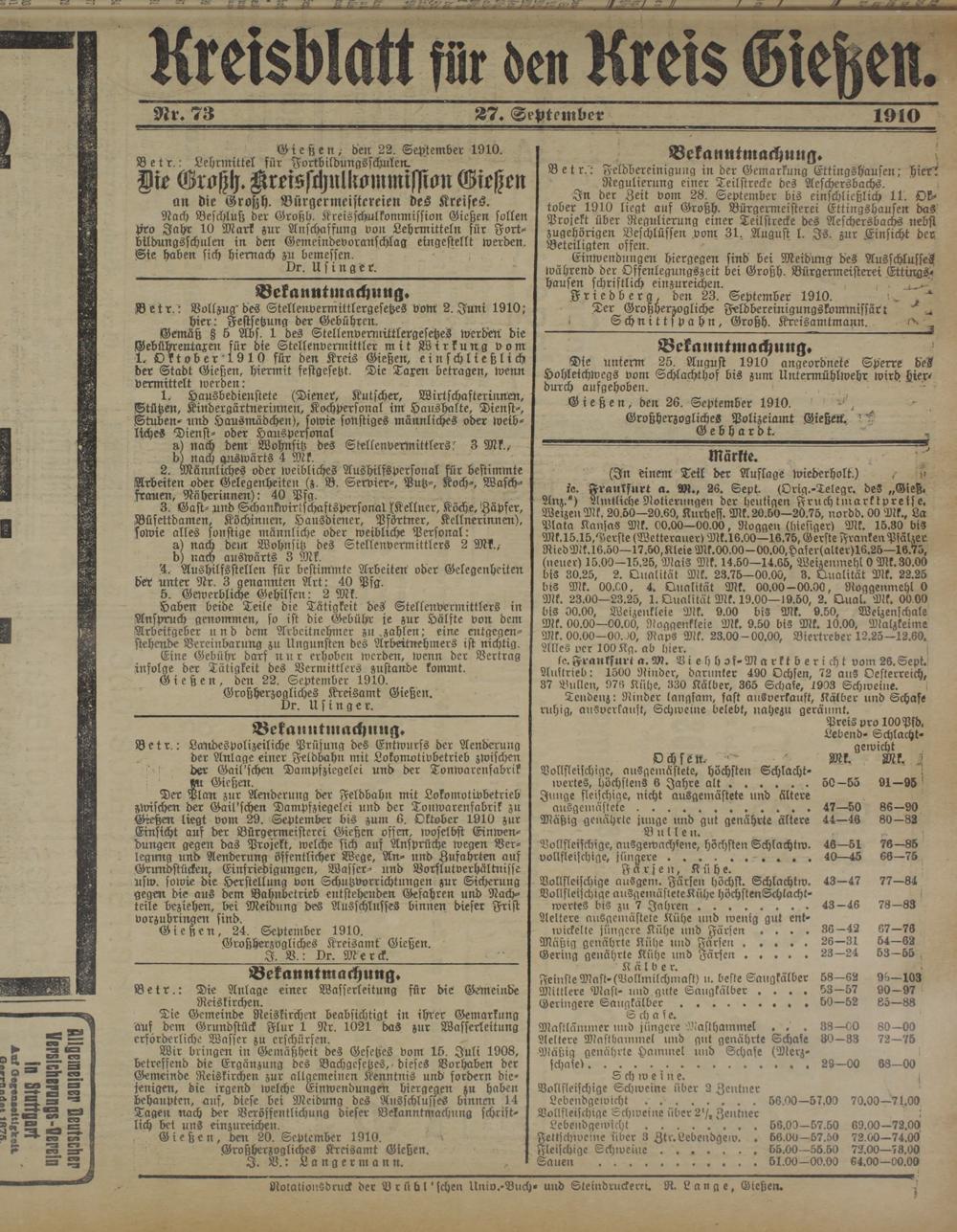 Gemäß § 6 Abs. 1 des Stellenvermittlergesetzes werden die GebührentaLen für die Stellenvermittler mit Wirkung vom L O k tob er 1910 für den Kreis Gießen, einschließlich der Stadt Gießen, hiermit festgesetzt. Die Taxen betragen, wenn vermittelt werden: