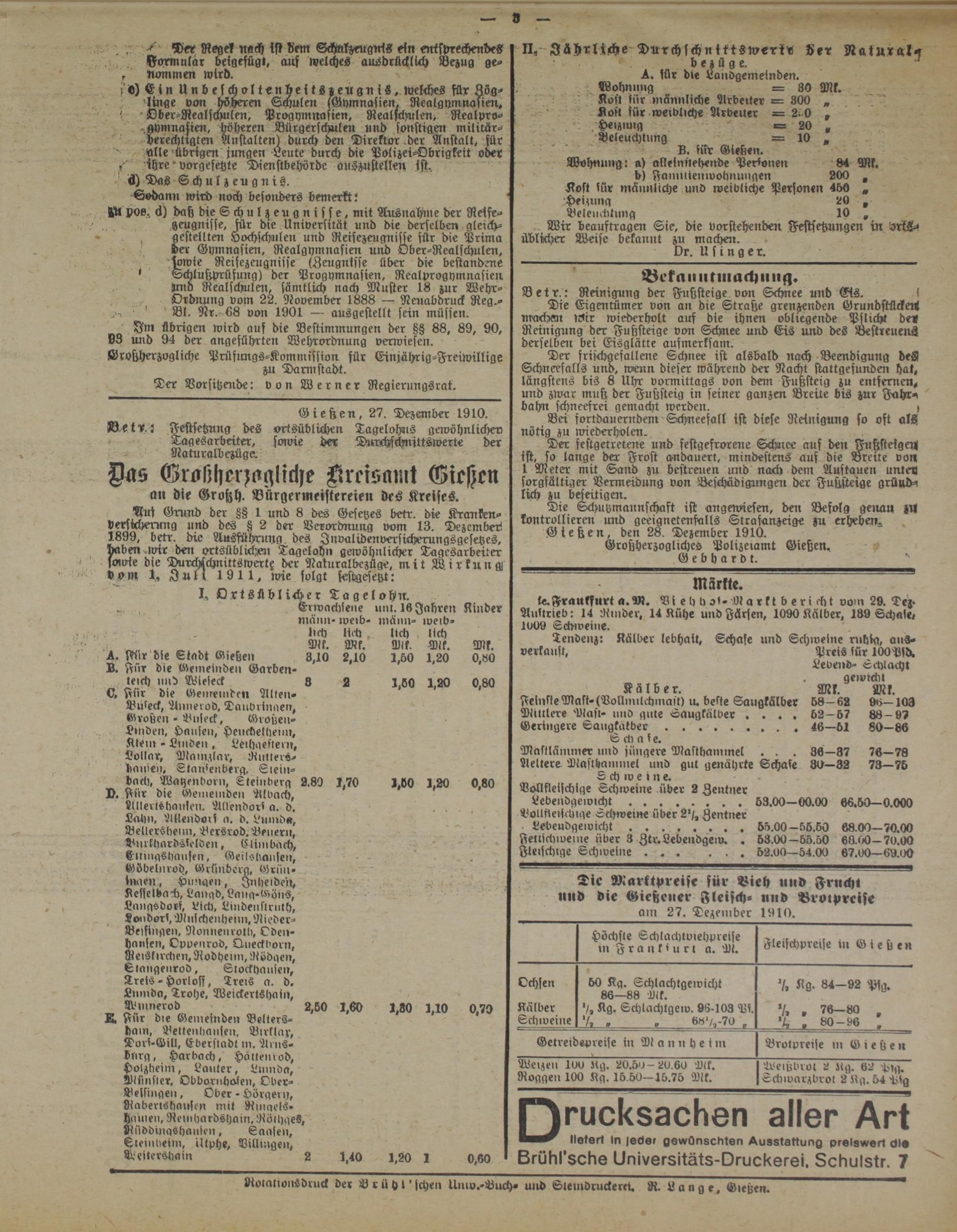 Gießen, 27. Dezember 1910. ©etr5 Festsetzung des ort £üb lieben Tagelohns gewöhnt ick>er> Tagesarbeiter, sowie der DurMckynittswerte der Naturalb^üge.