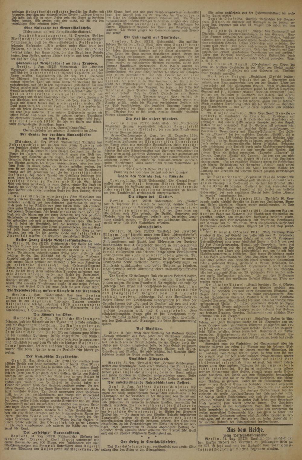 se durch unsere heldenhaften ruppen den Sieg zu er⸗ garer den wir für die 12 Sache mit felsen fester ubersicht erhoffen. In herzlicher Freundschaft Wilhelm. 5 1 8 1 ebung. en, 31. Dez. g lich.) Der Kais⸗ nach⸗ stehenden Armee. und ec erlassen: Seit fünf 3 des scheidenden Jahres steht die Monarchie in dem ihr und ihrem treuen Verbündeten 9 Krieg gegen zahlreiche und mächtige Feinde. Im Rückblick auf die beharrliche Ausdauer, K. esfreudigkeit und die todesmutige Tapferkeit meines Heeres und meiner Flotte gewinnt der Ausblick in das neue Kriegsjahr die erhebende Zuversicht, daß Oesterreich⸗Ungarns Kriegsleute zu Land und zu Wasser— schwersten Pro⸗ ben, die der Krieg ihren militärischen Tugenden auferlegen mag, mit Ehren bestehen werden zum Wohle des Vaterlandes. 2 wehmutsvoller Dankbarkeit gedenke ich der Vielen, die auß er Wahlstatt ihr Leben für unsere gerechte Sache hingegeben haben. Mit wärmster Anerkennung grüße 1 alle meine Braven, auf daß mit Gottes Hilfe das neue Jahr sie zum Siege führe. Die Dezemberbilanz unserer Kämpfe in den Argonnen Berlin, 1. n. Nichtamtlich.) Aus de G e wir Bie n 6 eren in den An kämpfenden Truppen gemachte triegsbeute beträgt insgesamt 2950 un verwundete Gefangene, 21 Maschinengewehre, 14 Minenwerfer, 2 Re⸗ volverkanonen, 1 Bronzemörser. Die Kämpfe im Osten. Rotterdam, 2. Jan. Russische Meldungen