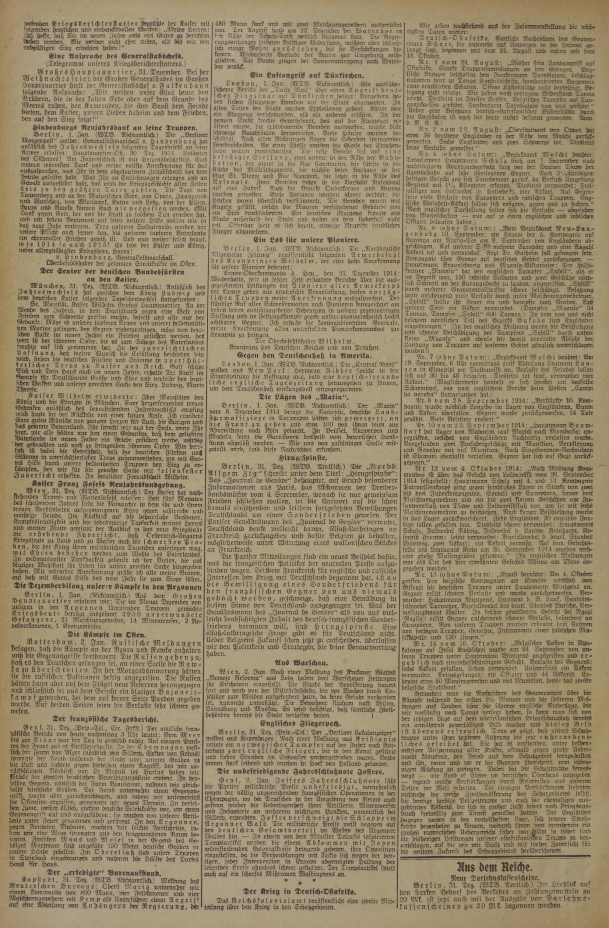 wesenden Kriegs berichterstatter begrüßte der Kaiser mit fi. und 9 Worten:„Meine Herren! hoffe, da im neuen Jahre recht viel Gutes zu berichten werden. Wir werden nicht eher ruhen, als bis wir den endgiltigen Sieg erfochten haben!“ Eine Ansprache des Generalstabschefs. (Telegramm unseres Kriegsberichterstatters.) Großes Hauptquartier, 31. Dezember. Bei der Weihnachtsfeier des Großen Generalstabes im Großen Hauptquartier hielt der Generalstabschef v. Falklenhayn folgende Ansprache:„Wir weihen unser Glas heute den Brüdern, die in der kalten Erde oder auf dem Grunde des Meeres ruhen, den Kameraden, die ihre Brust dem Feinde bieten, dem Kaiser, unsern Lieben daheim und dem Frieden, der auf den Sieg folgt!“ err Neujahrsdank an seine Truppen. rlin, 1. Jan.(WTB. Nichtamtlich.) Die„Berliner — 712 meldet: General seldmaxschall v.* denburg hat anläßlich des Jahreswechsels folgenden Tagesbesehl an seine Armee erlassen: Hauptquartier-⸗Ost, 30. Dez. 1914. Soldaten des Ostheeres! Am Jahresschluß ist mir Herzensbedürfnis, Euch meinen wärmsten Dank und meine vollste Anerkennung für das auszusprechen, was Ihr in dem abgelaufenen Zeitabschnitt vor dem geleistet— Was Ihr an Entbehrungen ertragen und an t ausgeführt habt, das wird die Kriegsgeschichte aller Zeiten stets zu den größten Taten zählen. Die Tage von r an den Masurischen Seen, von Opato, Iwangorod und Warschau, von Wloclawek, Kutno und Lodz, von der Vilica, Dura und Rawka können Euch nie vergessen werden. Mit Dank gegen Gott, der uns die Kraft zu solchem Tun gegeben hat,