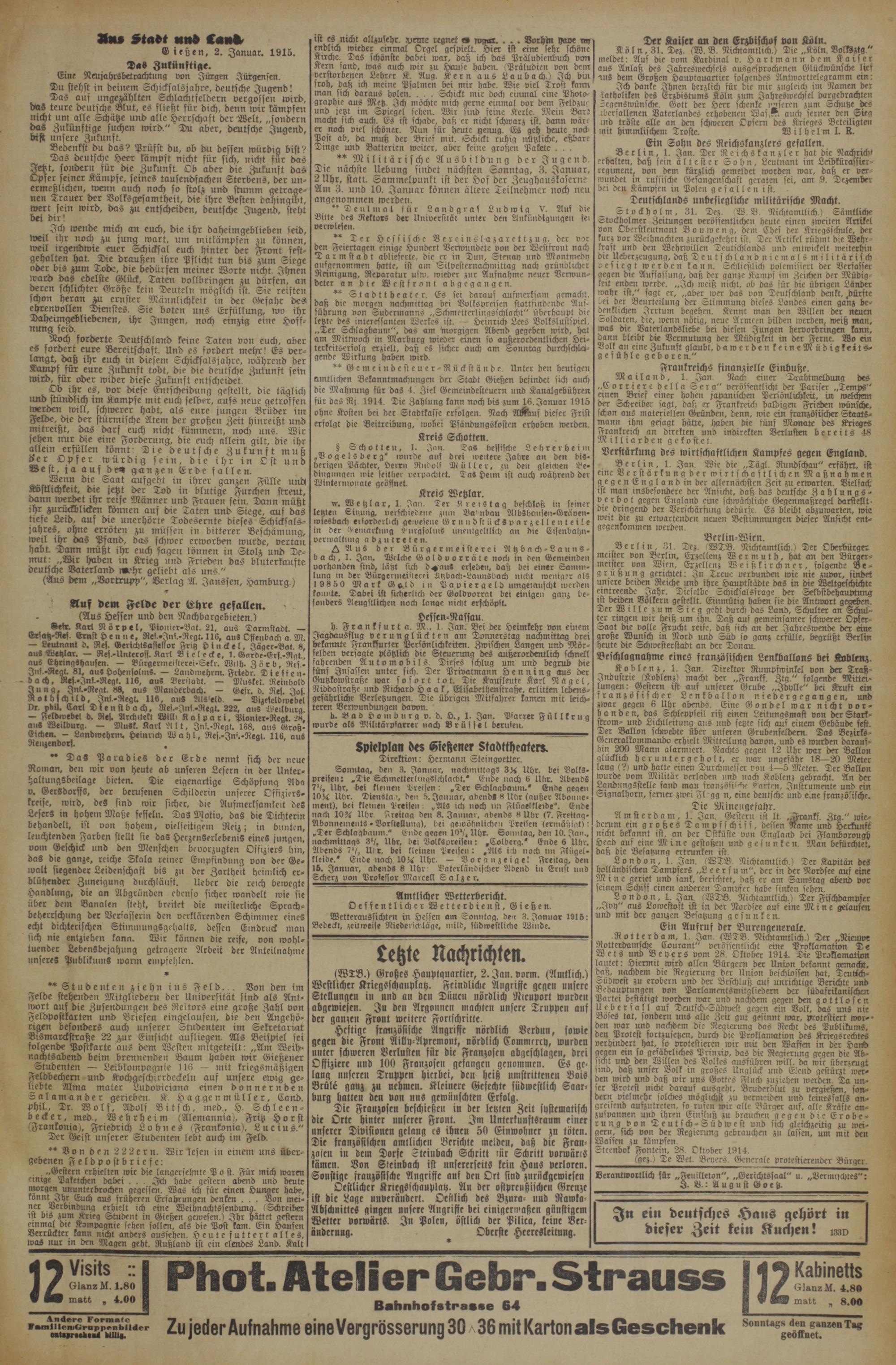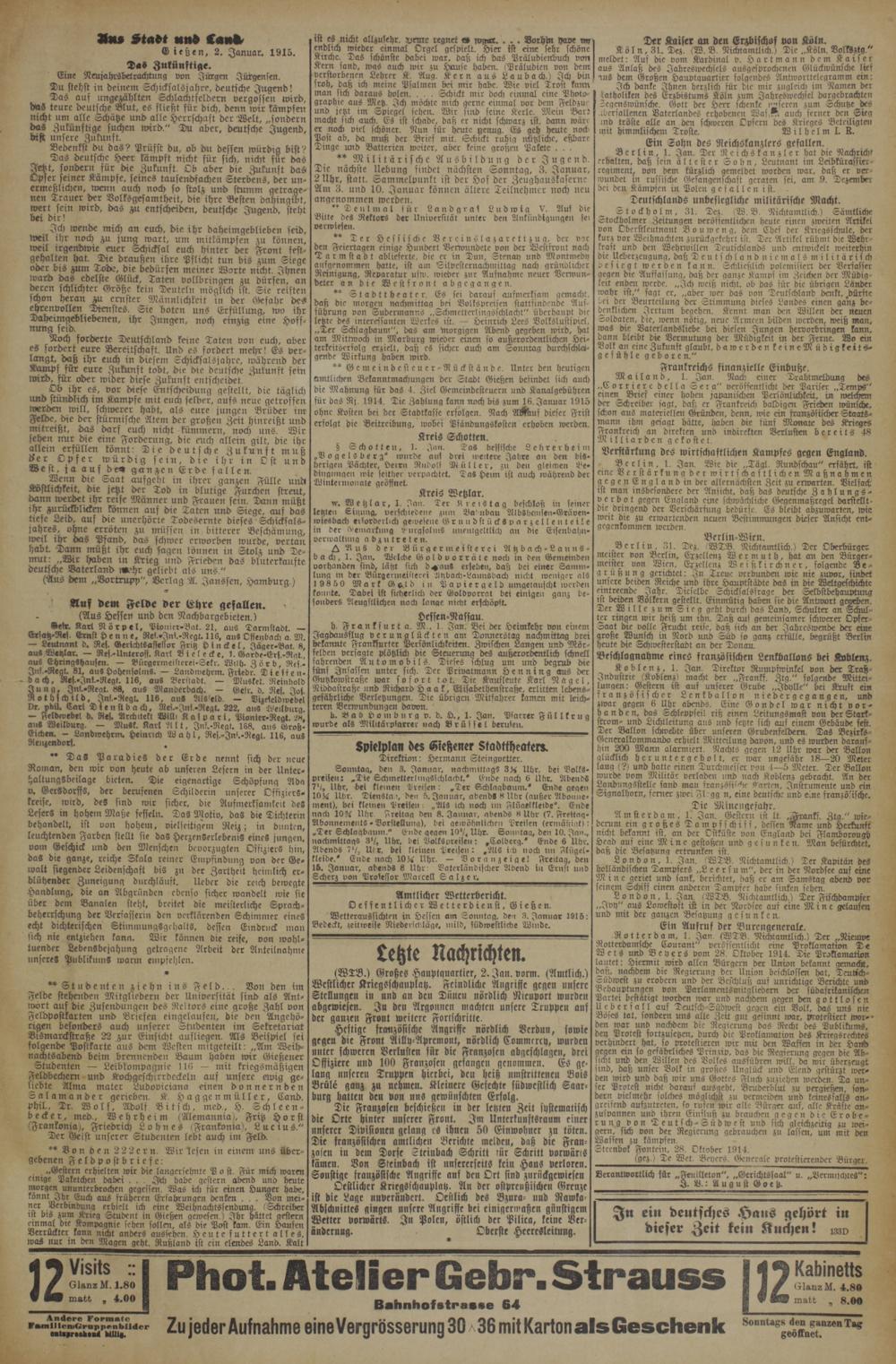 ist es nicht allzusehr. Vente regnet es wrr.. Vorhm hape un endlich wieder einmal Orgel gespielt. Hier ist eine sehr schöne Kirche. Das schönste dabei wax, daß ich das Präludienbuch von Kern fand, was auch wir zu Hause haben.(Präludien von dem verstorbenen Lehrer K. Aug. Kern aus Laubach!) Ich bin froh, daß ich meine Pfalmen bei mir habe. Wie viel Trost kann man sich daraus holen.... Schickt mir doch einmal eine Photo- graphie aus Metz. Ich möchte mich gerne einmal vor dem Feldzus und jetzt im Spiegel sehen. Wir sind feine Kerle. Mein Bard macht sich auch. Es ist schade, daß er nicht schwarz ist. dann wäre er noch viel schöner. Nun für heute genug. Es geh heute noch Post ab, da muß der Brief mit. Schickt ruhig mitzliche, eßbare Dinge und Batterien weiter, aber keine großen Pakete Militärische Ausbildung der Jugend. Die nächste Uebung findet nächsten Sonntag, 3. Januar, 2 Uhr, statt. Sammelpunkt ist der Hof der Zeughauskaserne Am 3. und 10. Januar können ältere Teilnehmer noch neu angenommen werden.. * Deulmal für Landgraf Ludwig V. Auf die Bitte des Rektors der Universität unter den Ankündigungen ser verwiesen.