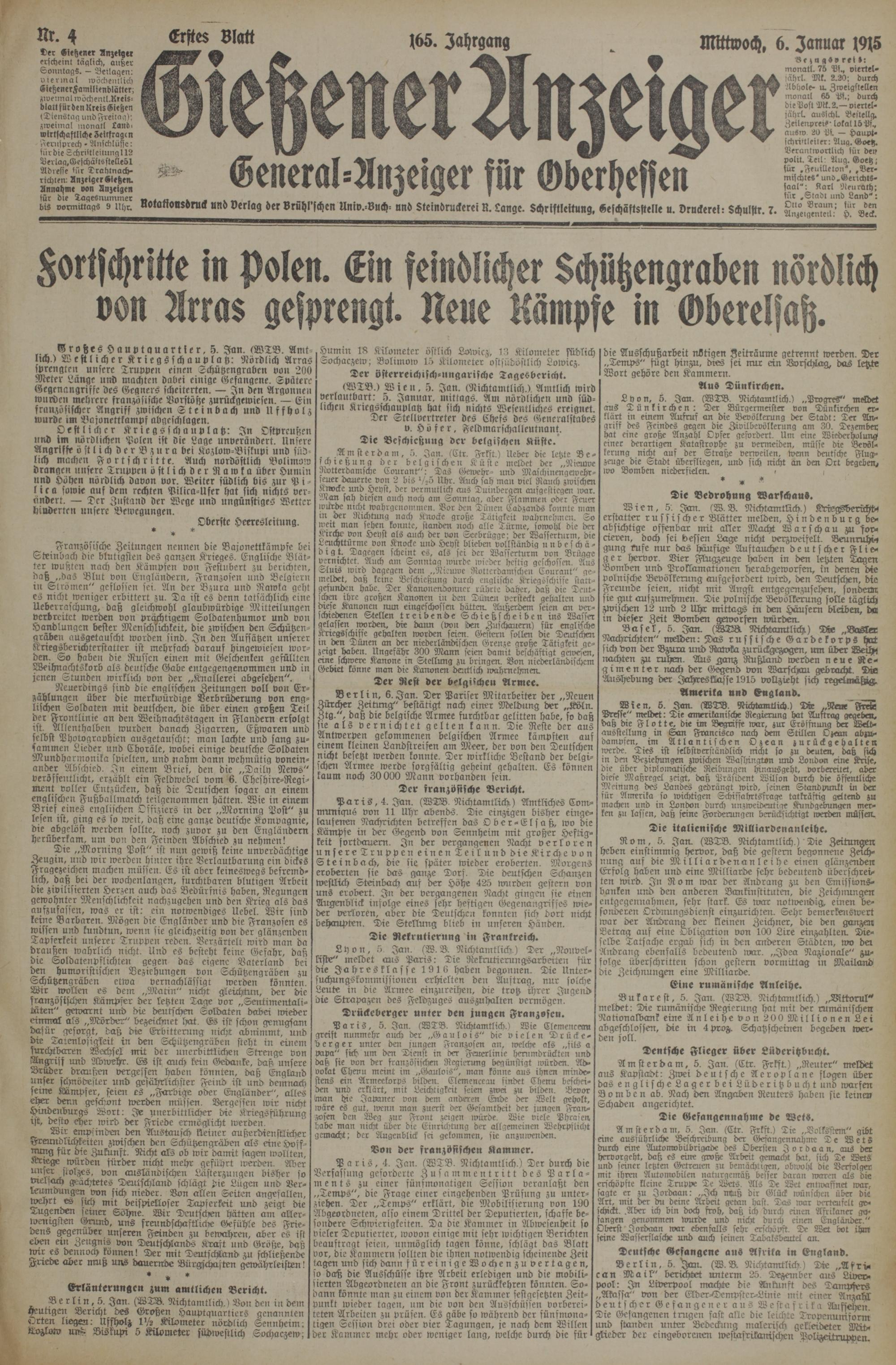 5 8 R 3* Erstes Blatt Der Sießener Anzeiger erscheint täglich, außer Sonntags.— Beilagen: viermal wöchentlich Gießener Familienblätter; zwermal wöchentl.Kreis⸗ blatt für den Kreis Gießen (Dienstag und Freitag): zweimal monatl Land. wirtschaftliche 255 n Fernsprech⸗Anschlüsse: für die Schristleitung112 Verlag, Geschäfts stelleö l Adresse für Drahtnach⸗ richten: Anzeiger Gießen. Annahme von Anzeigen