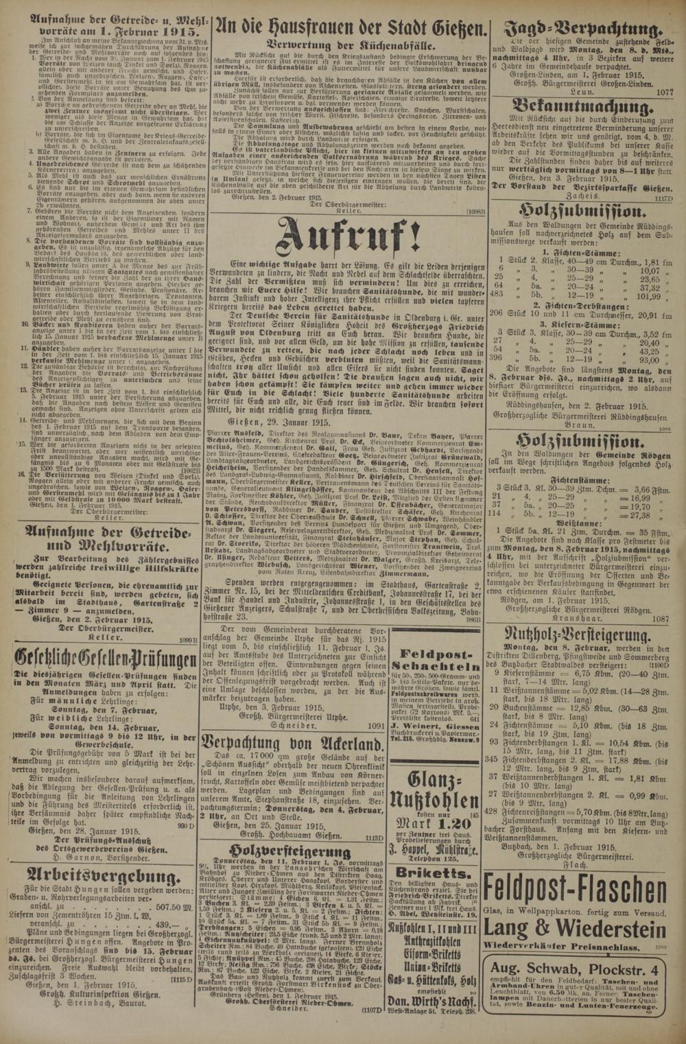 16 Die Verfütterung von Weizen(Dinkel und Spelz), Roggen allein oder mit anderer Frucht gemischt auch ungedroschen, sowie von Weizen, Roggen“, Hafer⸗ und Gerstenmebl wird mit Gefängnis bis zu 1 Jabr oder mit Geldstrafe zu 10000 Mark bestraft. Gießen, den 1 Februar 1915.