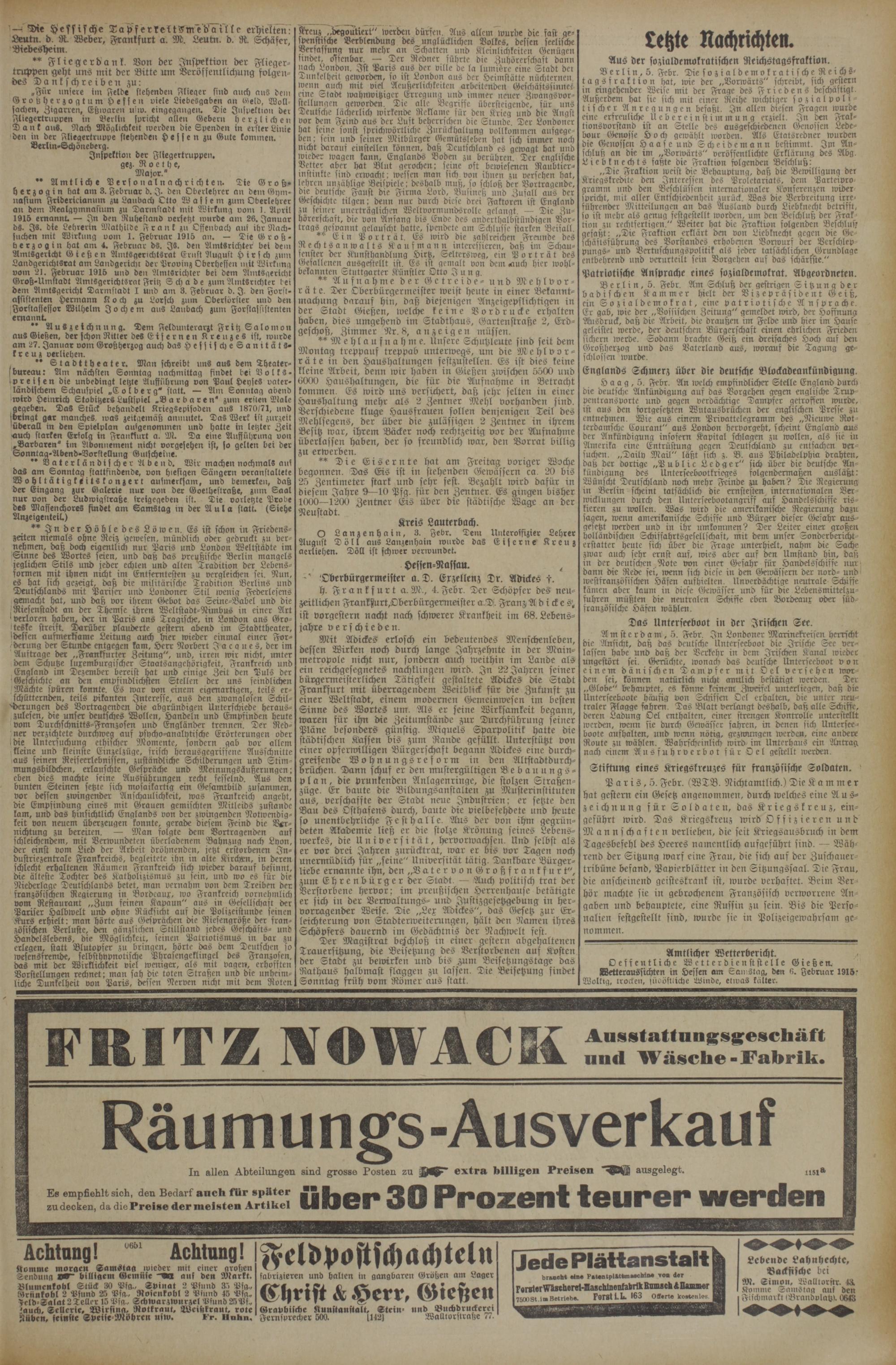 Amtlicher Wetterbericht. 5 Oeffentliche Wetterdienststelle Gießen. Wetteraussichten in Hessen am Samstag, den 6. Jebruar 1915: Wolkig, trocken, südöstliche Winde, etwas kälter.