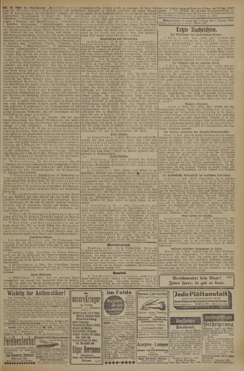 1 2— 2 + We.———— Wichlig für Asthmatiker! r. Im Felde„hermes Lehr- Institut Jetle Plättanstalt) 8 8 ne Herrn 1* 1 1 InsereNkrie br 3 3 r. West-Anl. 51 Bahnhofstr. 45 braucht elne Patentplattmaschine von der 5 cegenhuse. Post Ausen à. elme mub ein ros altungen für Alle Asthmatiker sein, indem ihnen ein Weg gezeigt 1 Kaiser's Forster wäscherei-Hanrhinenfabrik Bumsch& Hammer 8 wird, wodurch sofortige Linderung eintritt. Seine eige- im Felde 3 7500 St. Im Betriebe. Forst I. L. 163 Oflerte kostenles. nen Worte; Als ieh am zweiten Pfingstfest Astmel-Astlima- 2 1 ee ee 8 5 Pulver bekommen habe, zündete ich es sofort an und] empfiehlt zu billigsten 1 des Abends vor dem Schlafengehen nochmals. Ich habe Preisen: 3 Tannen schön schlafen konnen, das Pulver wirkt auf die Lungen- Taschen-Lampen Und la. Ersatz- ausgezeich-] Beginn neuer Handels- organe, das Poltern und Keuchen auf der Hrust lälit nach dale en. bezonderz Mart.. 6 nete Olenste kurse 1 N und 17 ich meine vollste Zufriedenheit mit Astmol ni 8 1 2 re Stenographle, Kaschinen-— Verstesgefingen aussprechen. 8 ndenbur,* f 8„ Buchfüh 2— 5 5 8 Astmal ist ein prompt wirkendes Mittel, welches den unten Feu 0*. 5—— 8 Anitliches 8 9 Asthmatlkern solertige Linder bringt.(Stram. 40. Grin- 6100 nie von Aerzten un! g V del 2 151 Late e e a 0 ate 200 Laschenmesser-Alcxer u. ülelts Dbceten n as Piaa Bieber,] Anmeldungen taglich. Steckbrief er eilgerung. 8 oste e Blechdose 2.50, zu haben in Drogerien u. wo Plakate sichtbar. kont 7 2 den Apotheken, Auf Wunsch Muster gegen Einsendung Neno und Mundo Nur in Puketen au 18 Pfg. Depen z. E dan 85 bi 50 20 Moutag, den, 8. ds. Mts., Lon 10 Ple. in Brletmarken dureh 314880 Taschen warmer, Es-Sporen eee ee Engel-Kpotheke, Erankfurt a. M., gr. Eriedberger Str. 46. Versand- Flaschen lr Lognak. v dee, Agen.* praktisch. Kontorarbeit. 2 9. Mai 1800 zu Arnsberg städter Haus/ 10660 hasiermesser um, engt unn. agen, 5 e ein ee 2 g Verlit 1 Kleiderschrank, Wewaes-Danetzteg] erzand- Büchsen für zuler, ers e ef ii die lintessuchungs bat we. 1 Nogauode! Cisschranf S Er——— Pell, Narmelade usw. ae 3 3 ee Wanbüähr 1 Nareg⸗ . 1 c 2 7 25 1 5 tert— 2 Azetylen* Lampen im Felde 8— gestell, eine— liefert in praktischer solider N—. vusta.. lessen 2. g 2 für Es wird ersucht, n zu tung, sowie eine größere Aaatssio rung in derer en ar 10 ert ant e Kü el n mmer- ung Flarbeleuchtung verhaften und an die uächste Partie Schuhwaren u pg. Preiseg.. Wieveck; Fr. Volk II. u En. sowle 4507] Militärbebörde zum Weiter-] zwangsweise gegen bar 5 lersand p. n, ere baranlis. eee Reeker VII. in. Curbid transport hierher abzulie— 2 5 . taus. U.sämtl. Waren WIIn. Ruhl in Gr-Buseck; fi billigste is fern. ersteigerung 8 Postfach 194.. Hans- und Küchen- Gerate Tuheienmanu. stadt-dpotf, 9 n—— Giezen, 4 Februar 1016. Feitmmt, anz e e ann.„ Eisenwaren“ Haus⸗ Ersatz- Bataillon Gießen, 5. Februar 1915. del gammefaütträgen Vergütung 0 und Küchengeräre⸗Handlung. des Inj.Regts. Nr. 116. Seivel, Gerichts vollzieher.