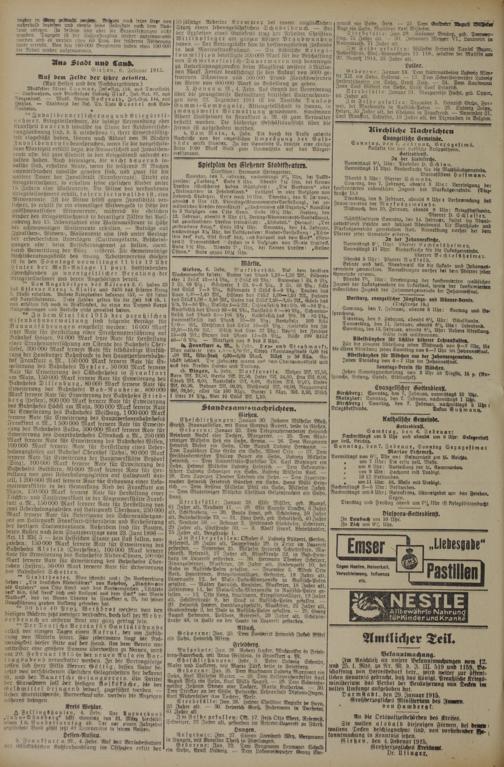 merich ein Sohn, Fritz.— 25 Dem Vogt ein Sohn, Matthias Karl Wilhelm. Sterbefälle. Jan. 29. Susanne Bender, geb Demmer⸗ ling, 75 Jahre alt.— 30. Johannes Metzger VI., Landwirt in Nonnenroth, 71 Jahre alt. 8 3 1 Im Felde gefallen: Wilhelm Heinrich Daniel Bauer, Postassistent, Einj.⸗Unteroffizier 12. 118., 22. August 1914, 23 Jahre alt.