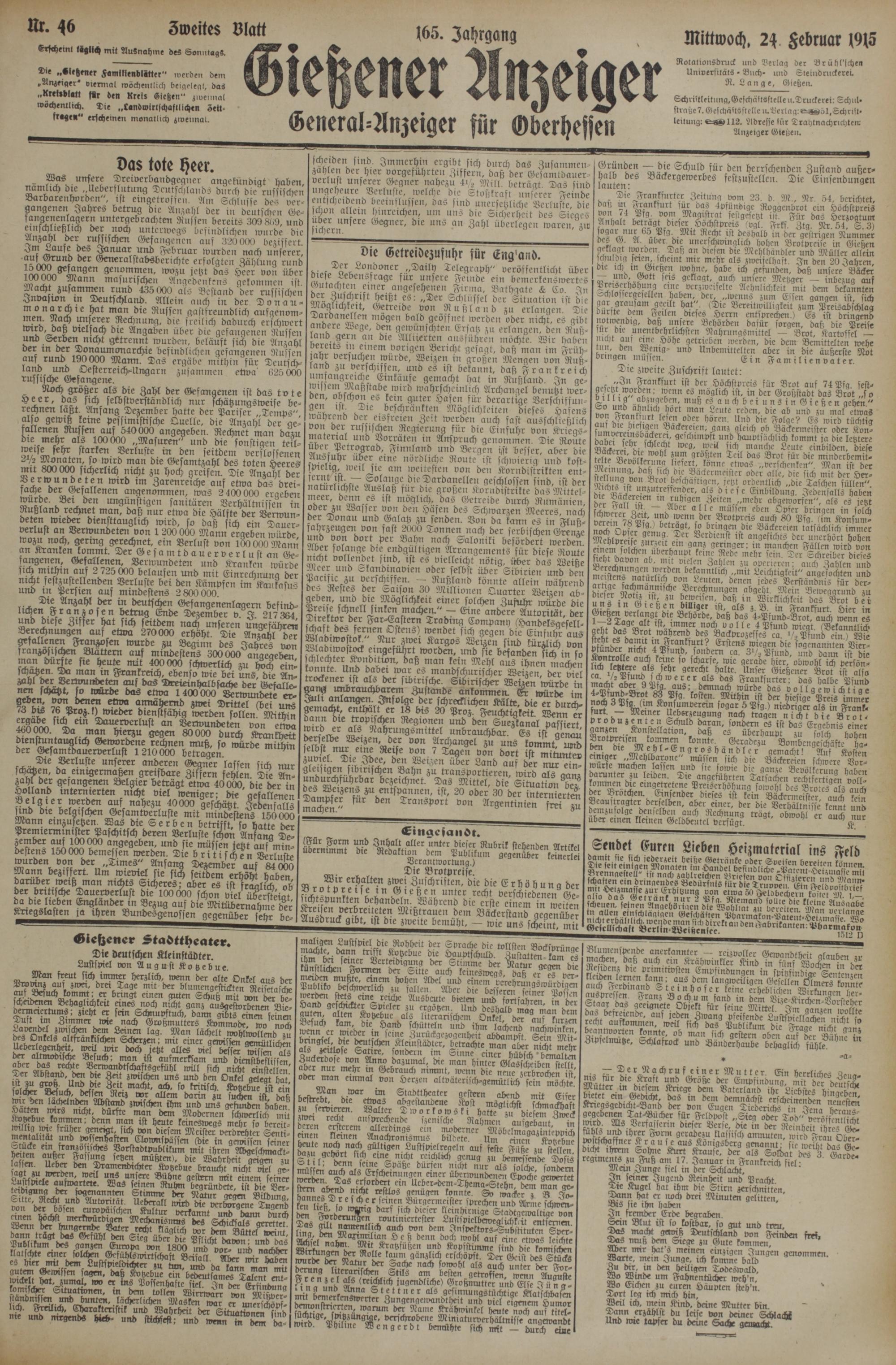 u. 4 gmeites Platt 105. Jahrgang mittwoch, 24. Februar 1015 Erscheint taglich mit Ausnahme des Sonntags.