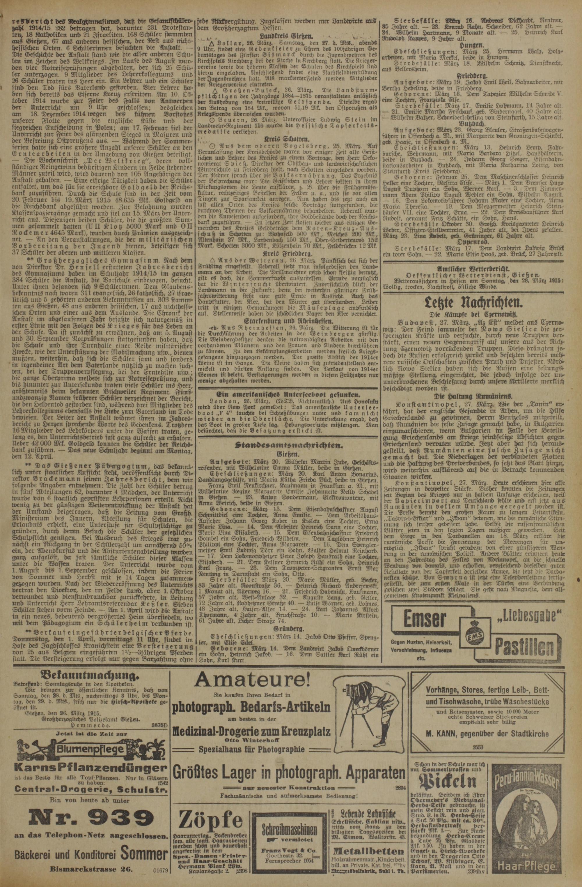 ** Großherzogliches Gym nasinm. Nach dem von Direktor Dr. Hensell erstatteten Jahresbericht des Gymnasiums haben im Schuljahr 1914/15 im ganzen 384 Schüler die Anstalt, die Vorschule einbezogen, besucht. Unter ihnen befanden sich 9 Schülerinnen. Dem Glaubens⸗ bekenntnis nach waren 311 evangelisch, 26 katholisch, 27 israe⸗