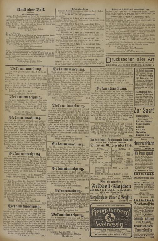 chen an Samstagen in sich schließt. Gießen, den 27. März 1915. Großherzogliches Kreisamt Gießen. Dr. Usinger.