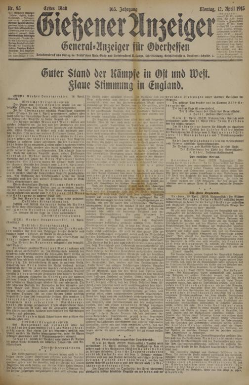 N 5 N 3. * Erstes Blatt ir Sleßener Anzeiger Ischeint täglich, außer Sonntags.— Beilagen: viermal wöchentlich Famil ienblätter; U wöchentl. Rreis⸗ latt für den Kreis Gießen (Dienstag 3 zweimal monatl. L