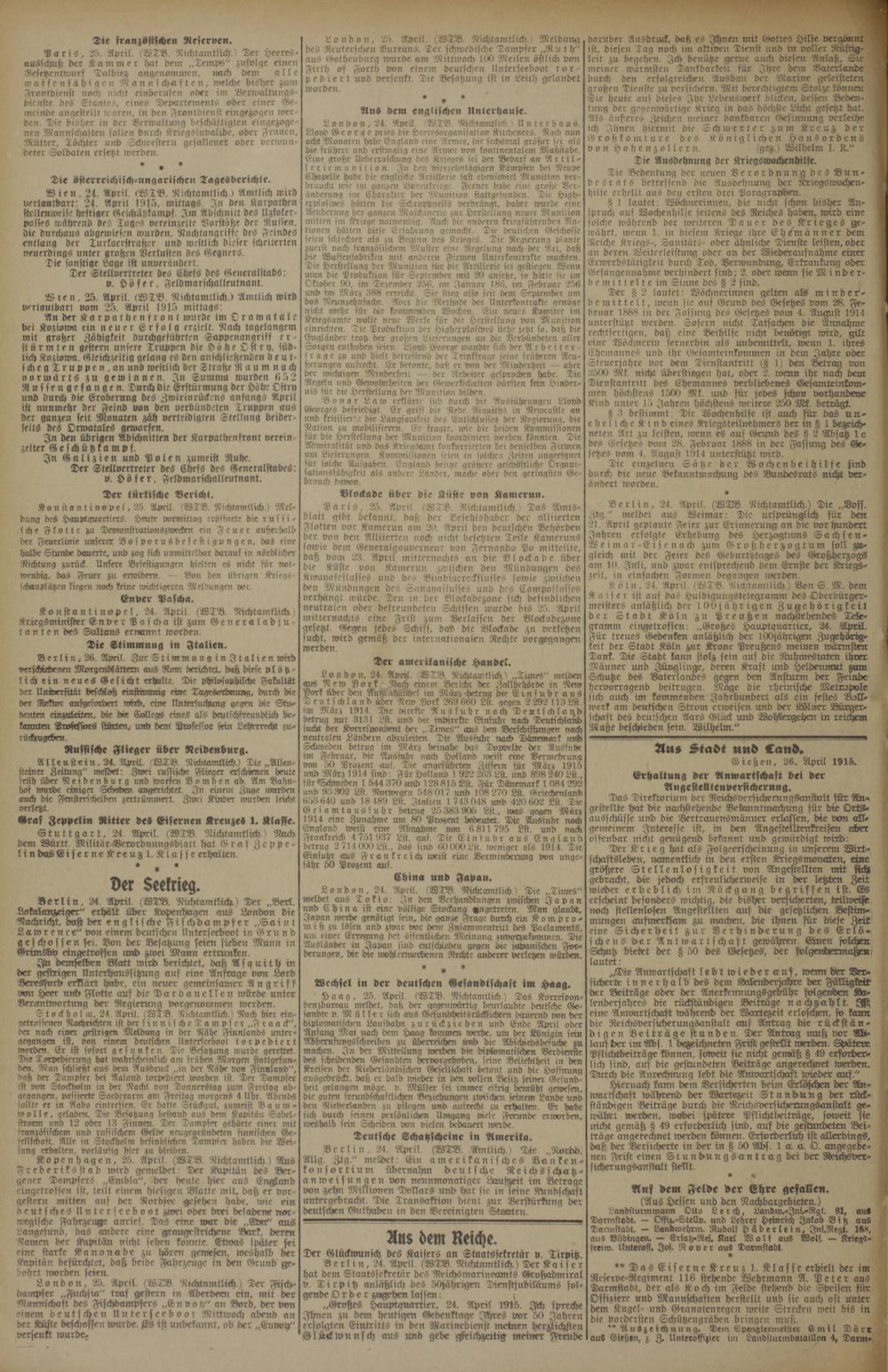 Aus Stadt und Cand. 2 Gießen, 26. April 1915. Erhaltung der Anwartschaft bei der Angestelltenversicherung.