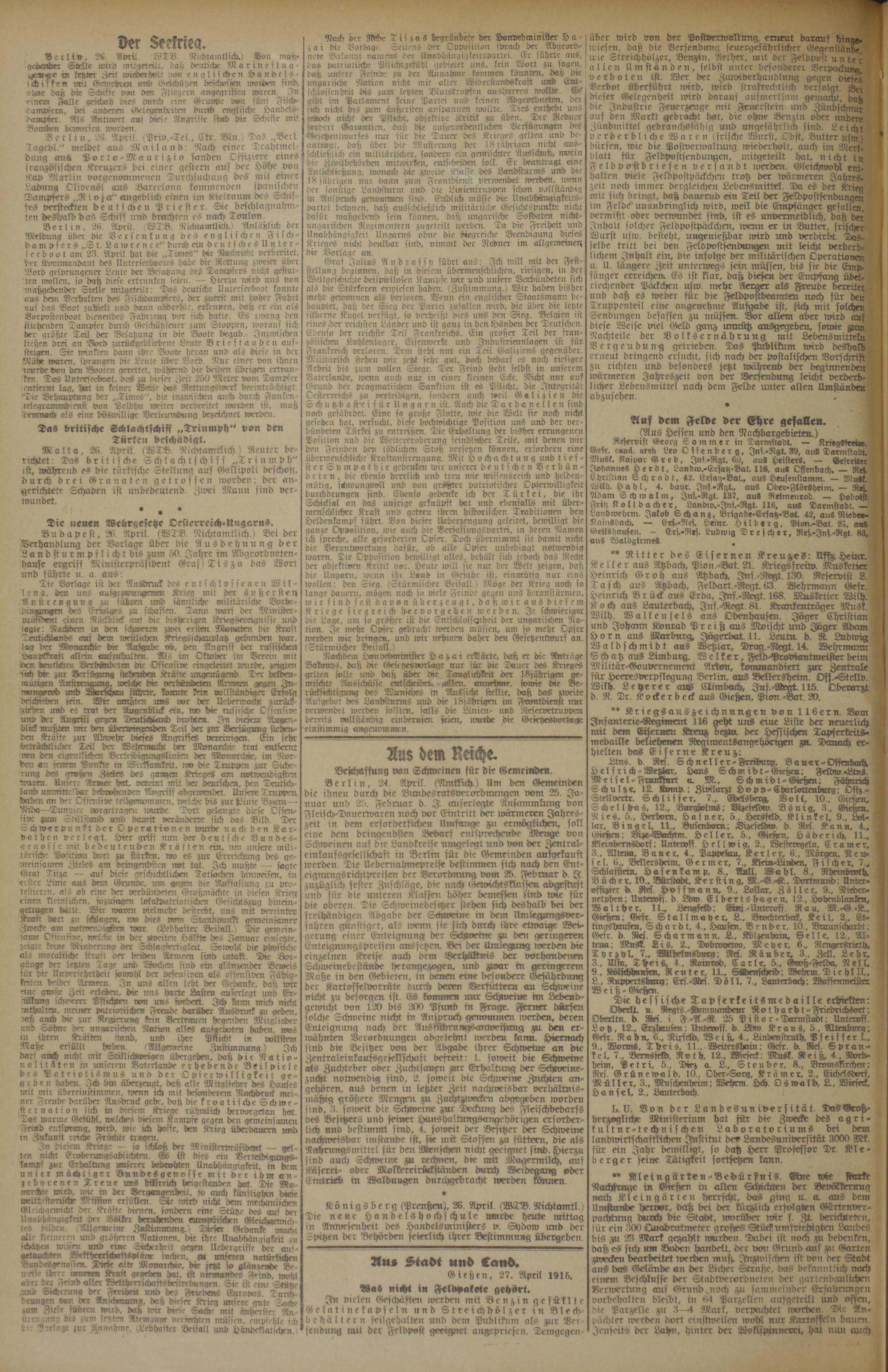 Königsberg(renden) 28 April.(WB. Nichtamtl.) Die neue Handelshochschule wurde heute mittag in Anwesenheit des Handelsministers v. Sydow und 89 — der Behörden feierlich ihrer Bestimmung übergeben. — ů ů ů ů Aus Stadt und Cand. Gießen, 27. April 1915.