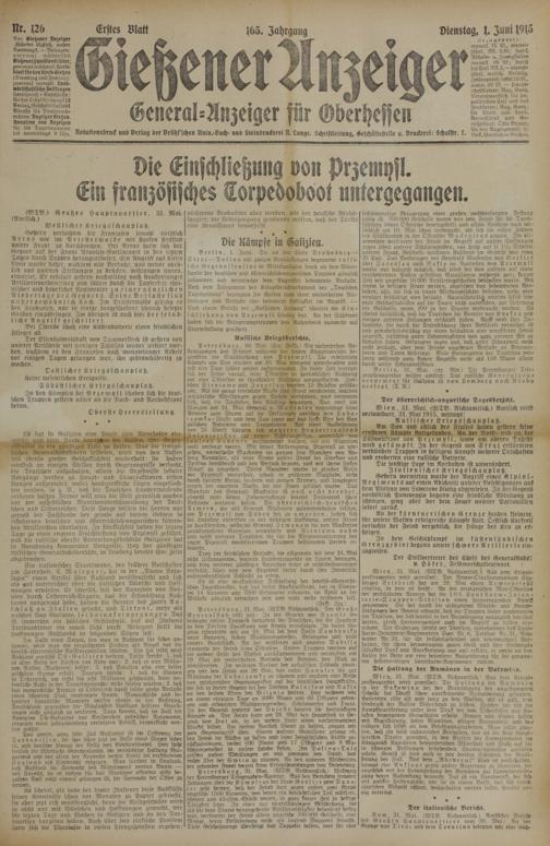 Berlin, 1. Juni. Die an Stryj— Dolina mit großen Verste sche Gegenoffensive in Mittel stande der deutschen und österreichisch⸗un zusammen und verursachte dem A Nach dem Telegramm des Kriegsberic Tageszeitung“ bezeugten die Russen derlagen und Verluste eine besonde Nach einem Bericht der„Vossischen Z schließung von Przemyjsl ständ haben sich die Belagerungstruppen Sturmstellung genähert. ö